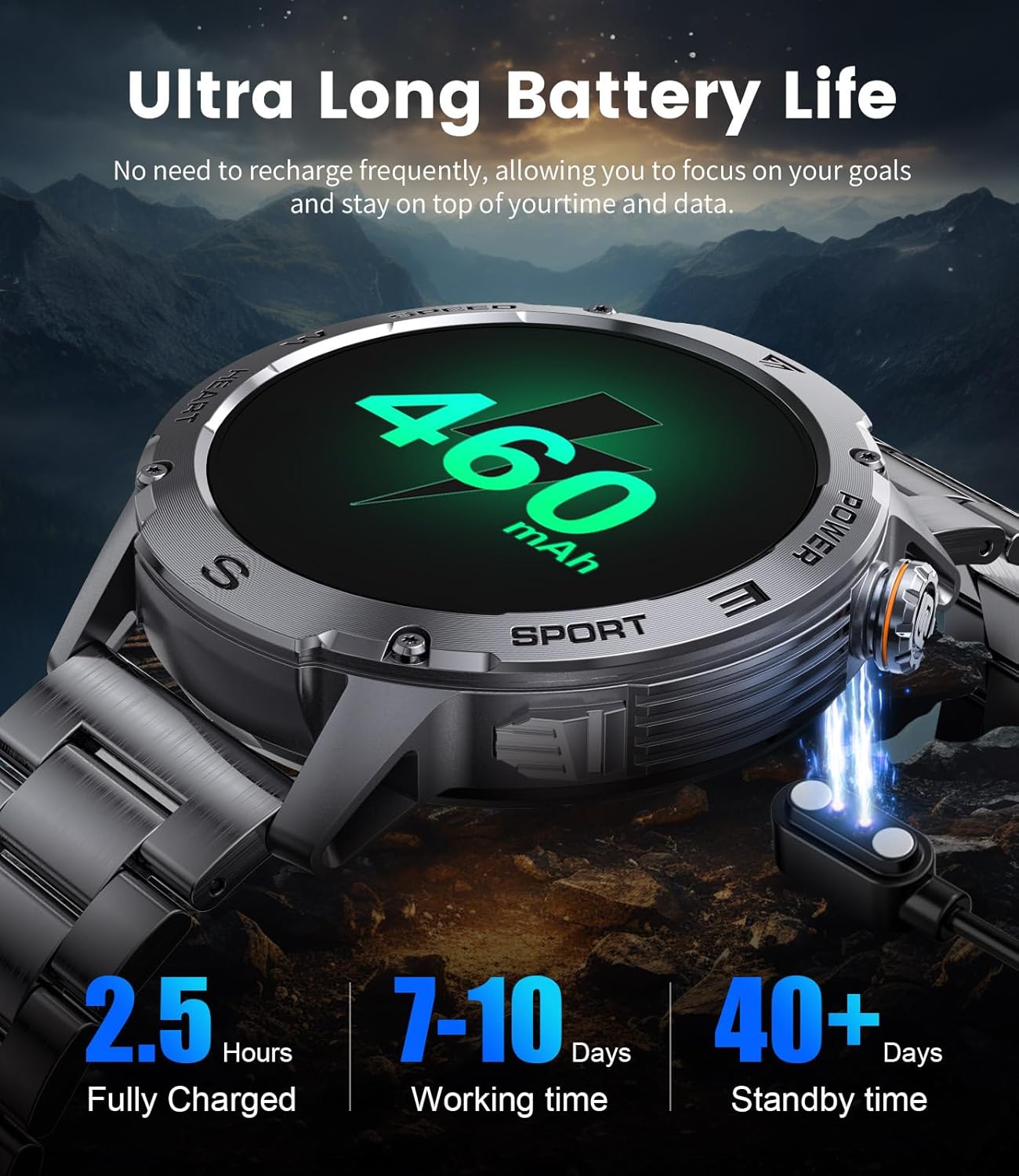 【IP68 Waterproof & 460mAh Low-power Battery】:This montre intelligente homme features a high-capacity 460mAh battery that reduces charging frequency and enhances the user experience. With an IP68 waterproof rating, it can handle everyday water exposure. (However, it is not recommended to wear the watch while showering or swimming for extended periods, as this may affect its durability.)