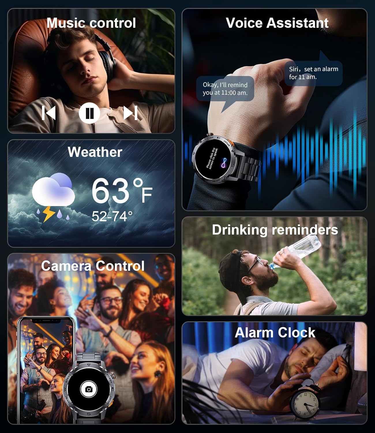 【Bluetooth Calls & Smart Notifications】:This android smart watch features advanced Bluetooth 5.0 technology, significantly reducing call latency for a smoother connection. Whether indoors or outdoors, you can easily stay linked to your phone without worrying about missed calls. Once connected, the military watch lets you answer or make calls directly from your wrist and receive social media message notifications. For added convenience, simply swipe down and tap the moon icon to activate “Do Not Disturb” mode, ensuring peace and quiet whenever you need it.