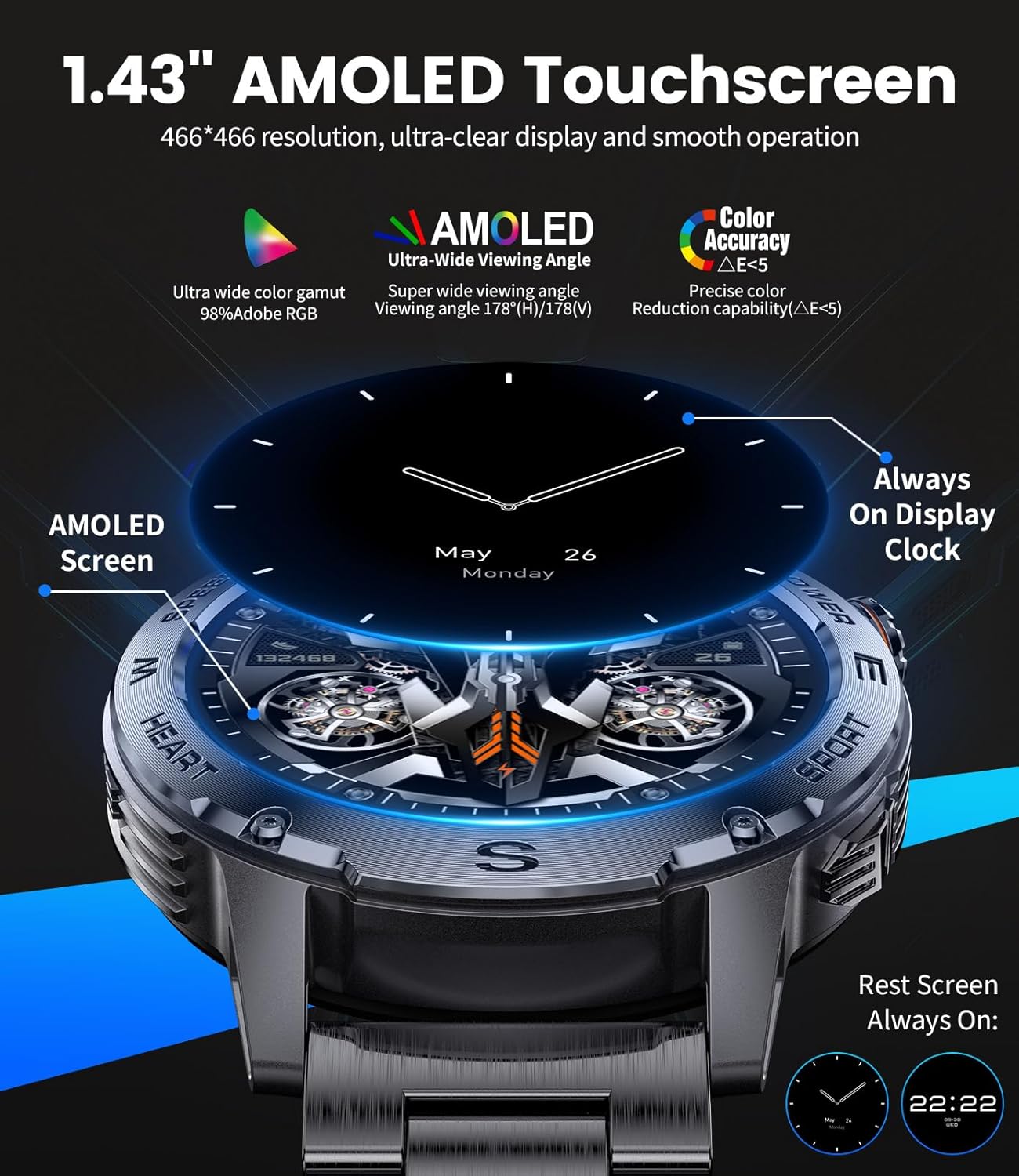【1.43″ HD AMOLED Touchscreen & 3 Straps】:This rugged men’s smartwatch features a 1.43-inch HD AMOLED touchscreen that strikes the perfect balance in size for a comfortable fit. With a sharp 466×466 resolution, it delivers vibrant colors, deep contrast, superior energy efficiency, and ultra-responsive touch sensitivity — far outperforming LCD and TFT screens.It offers over 300 watch faces to suit your style (11 built-in + 290+ available via app). This men’s smartwatch comes with three interchangeable straps—black stainless steel for a sleek, durable look, and 2 black silicone for a lightweight, flexible fit perfect for workouts. Switch easily to match your style or activity.