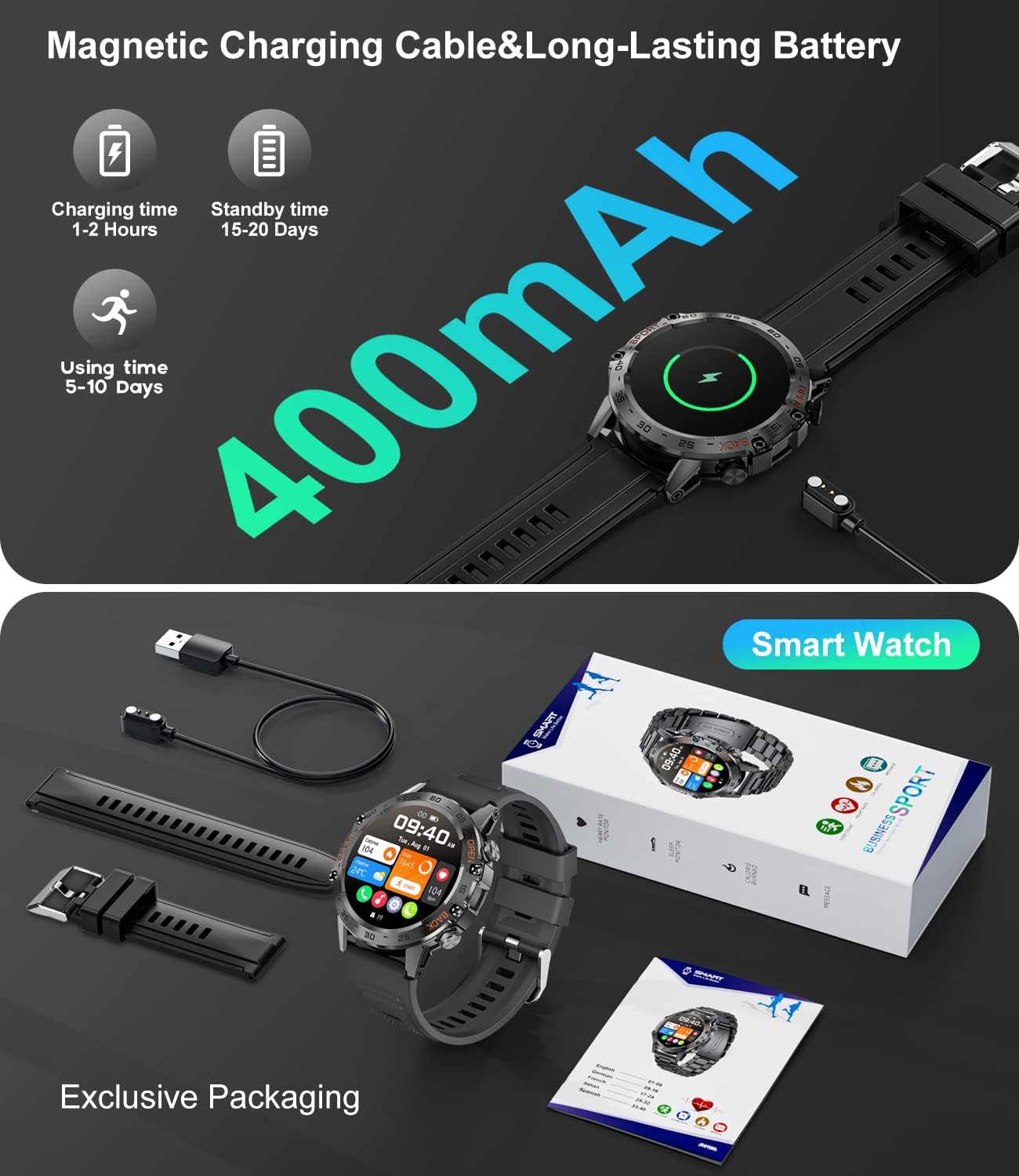 【Compatibility and After-Sales Service】The sport smart watch is compatible with most iOS 8.0 and Android 4.4 and above smartphones. We offer a 24-month warranty and if you have any questions about the product, you can contact us and we will reply within 24 hours to help solve your problem. The men’s smartwatch is the best gift choice for anniversaries, birthdays, and graduations for family and friends.