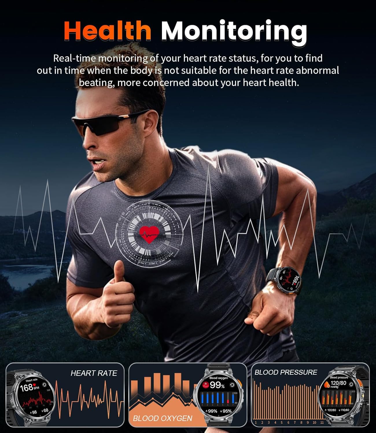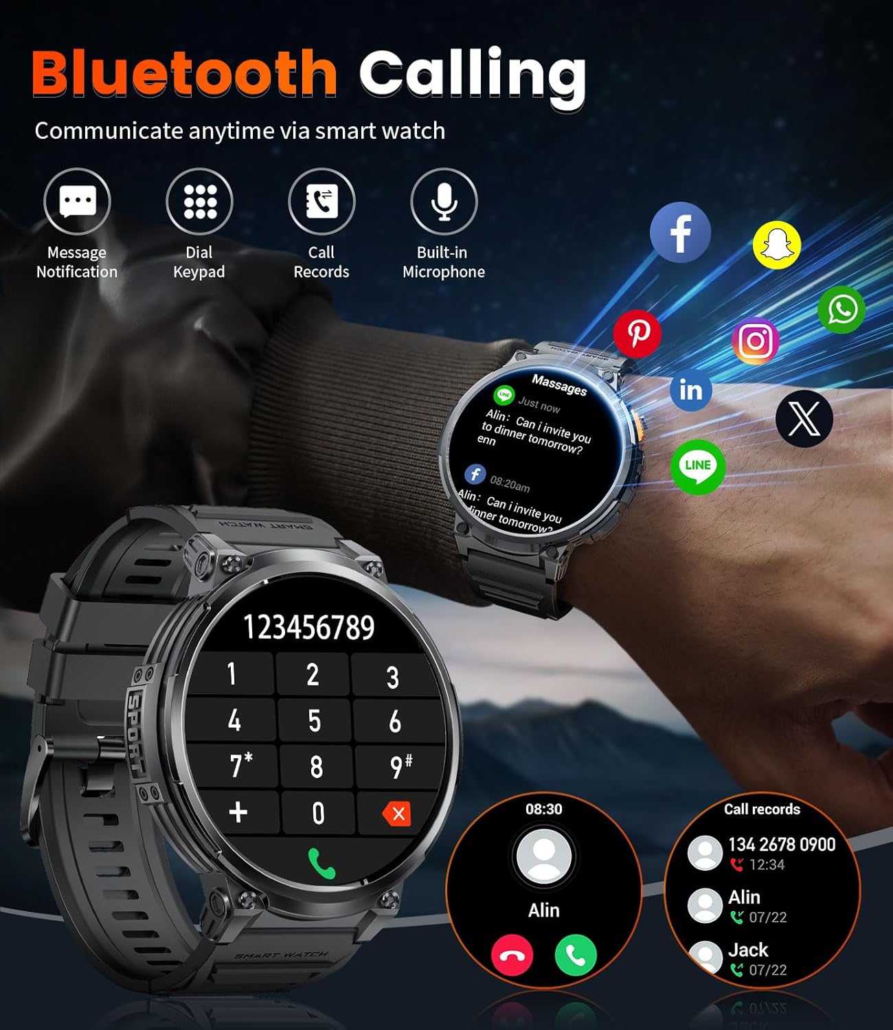 ✅【Military Smartwatch with LED Flashlight】The mens smart watch has a very bright LED flashlight on the side that illuminates up to 20 meters, providing a reliable source of light. Whether you are camping or hiking at night, searching for items in your car or emergency lighting in case of a power outage, this powerful flashlight provides enough brightness to ensure safety and convenience even in the dark.