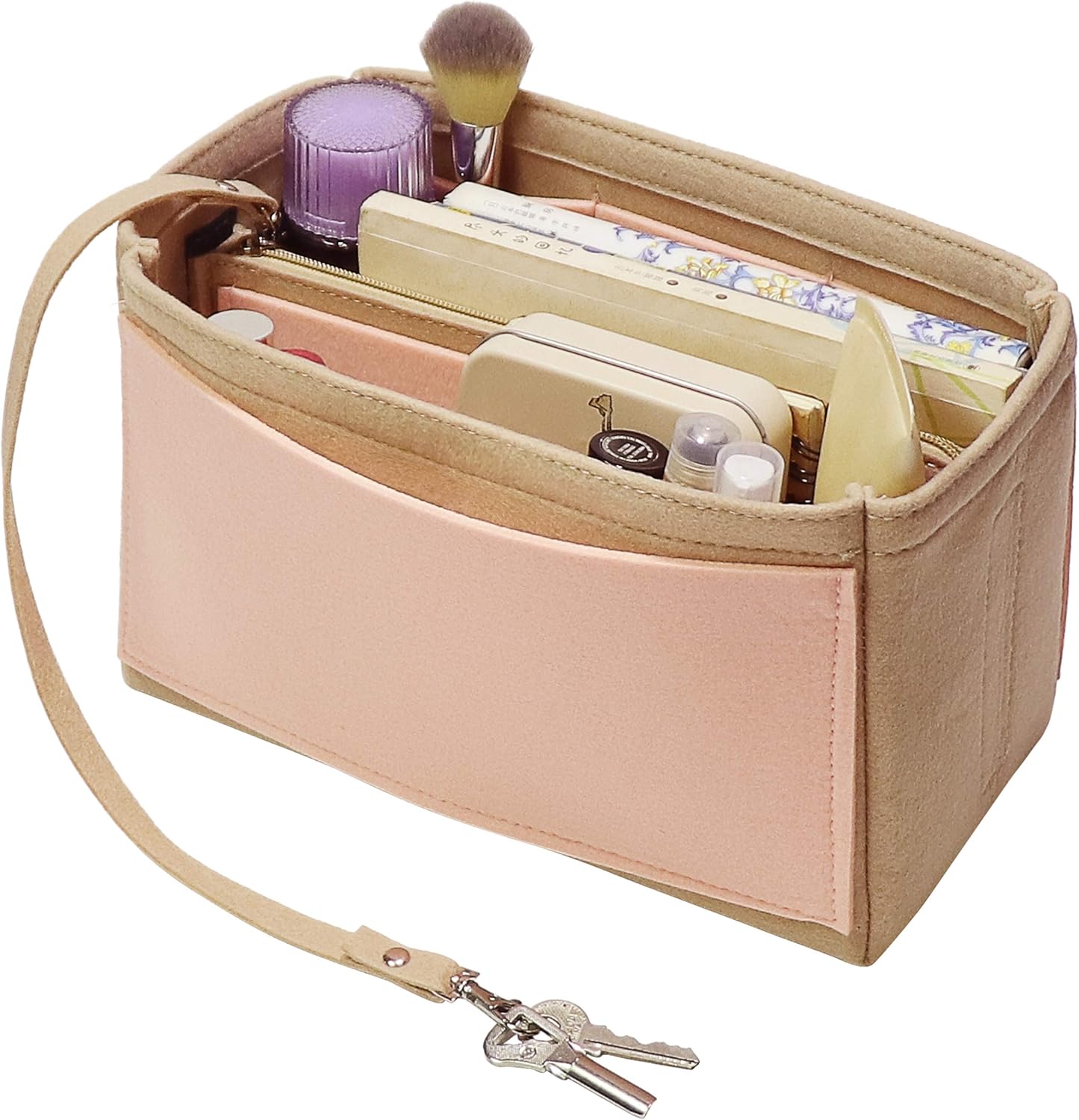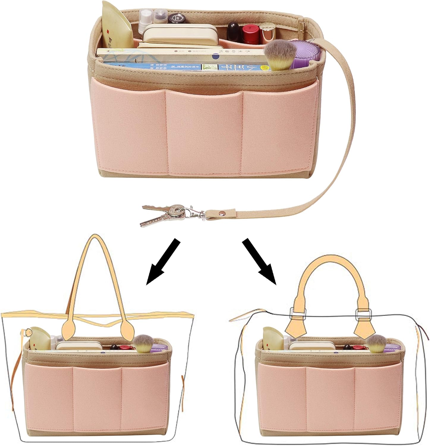 To save you all the trouble, time and moments of embarrassment, here is what we provide — Our Purse Organizer Insert – Tote / Handbag with key chain option is for you.