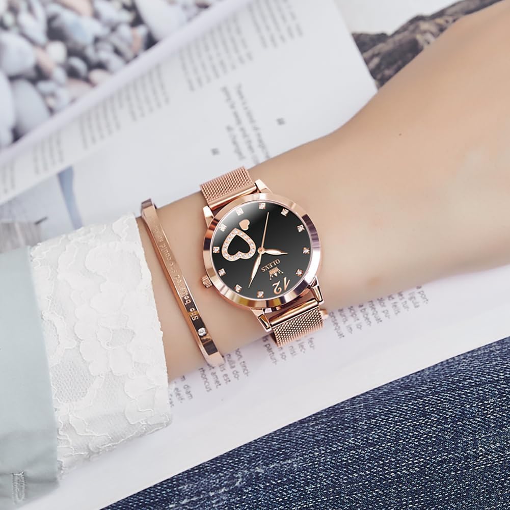 OLEVS Watch for Women Rose Gold Fashion Dress Heart Diamond Stainless Steel Mesh Strap Analog Quartz Ladies Wrist Watches Waterproof Luminous Bracelet Set Gifts