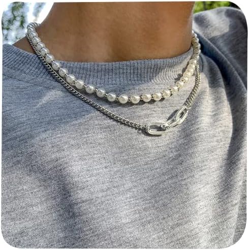 Pearl Necklace Men Silver Chain Necklace Faux Pearl Necklace Mens Pearl Necklace Layered Cuban Link Necklace Christmas Jewelry Gifts for Him