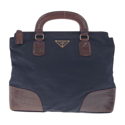 PRADA Tessuto embossed Triangle with logo Tote Bag Navy Brown Nylon/leather
