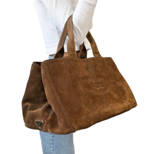PRADA Vintage Big Logo Canapa Tote Bag Brown Gold Suede Stitch Snap Button