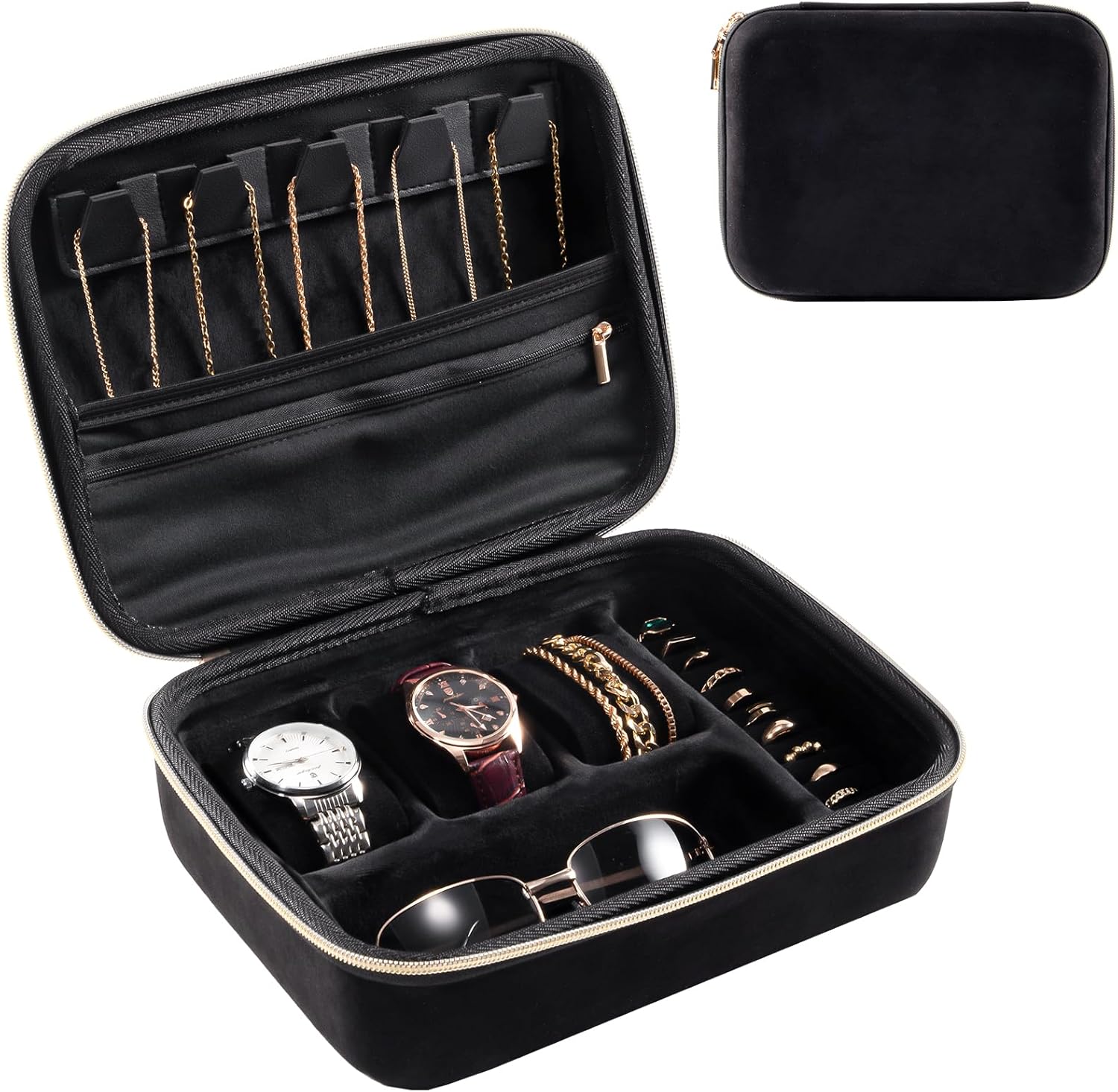 ProCase Mens Travel Jewelry Case, 3 Slots Watch Travel Case, Watch Accessories Carrying Case, Glasses Necklaces Rings Bracelets Zippered Organizer Bag for Men -Black