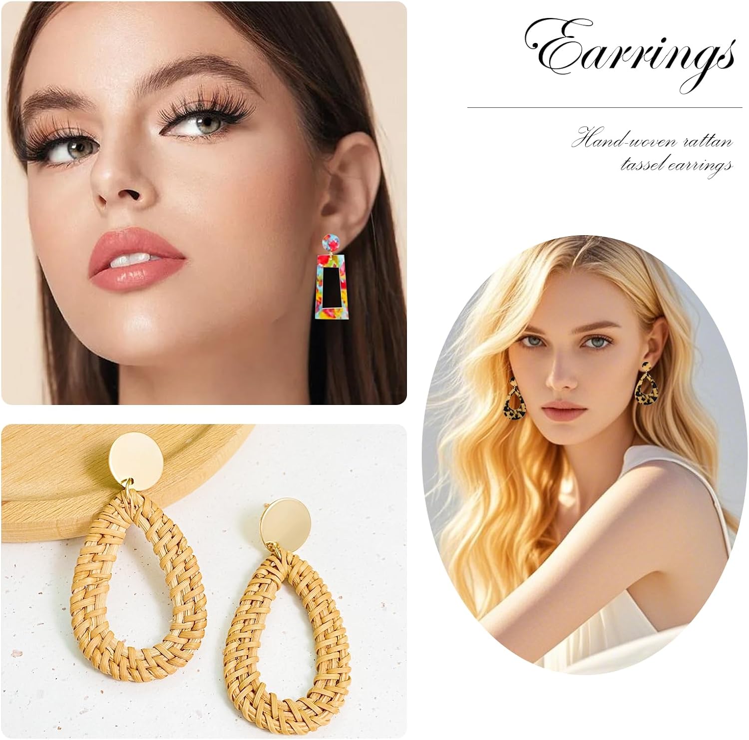 Boho earrings set of 12 pairs dangle earrings, each pair is individually wrapped in a bag. These rattan earrings belong to boho style, women earrings are suitable for daily wearing, beach, wedding, date, prom, summer, vacations, or any occasions you want to be more charming and get more compliments.