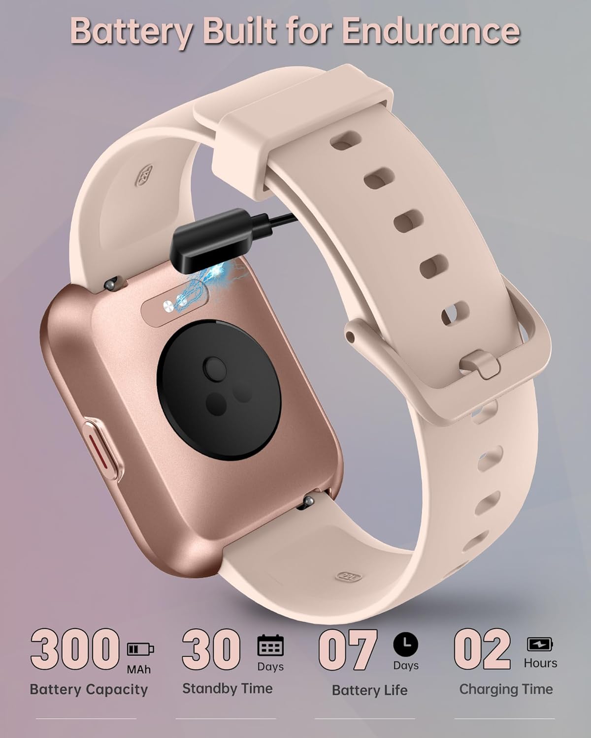 300mah large battery to release your worries of not enough power. Magnetic charging allows the watch to get power quickly, and it takes less than 2 hours to fully charge.