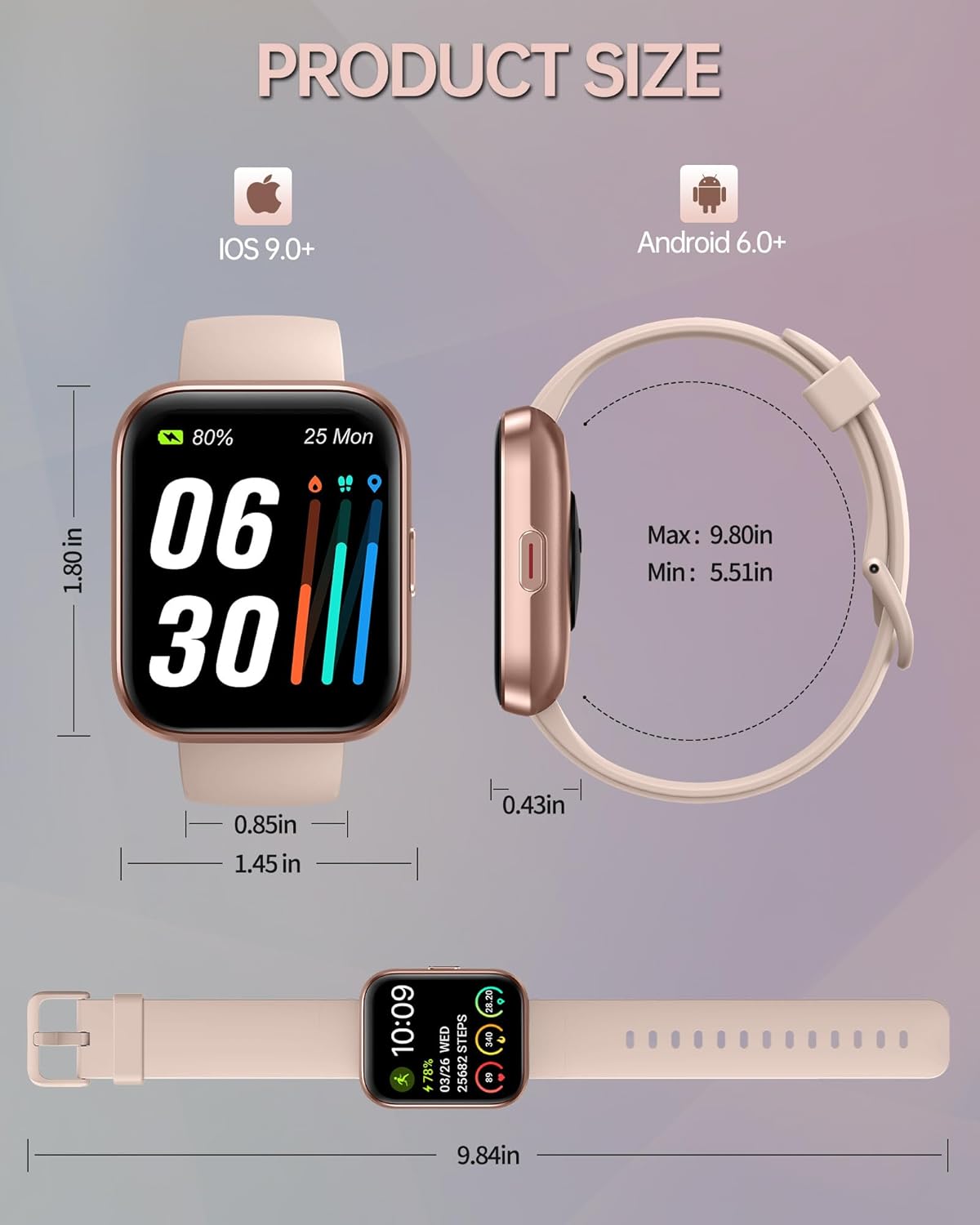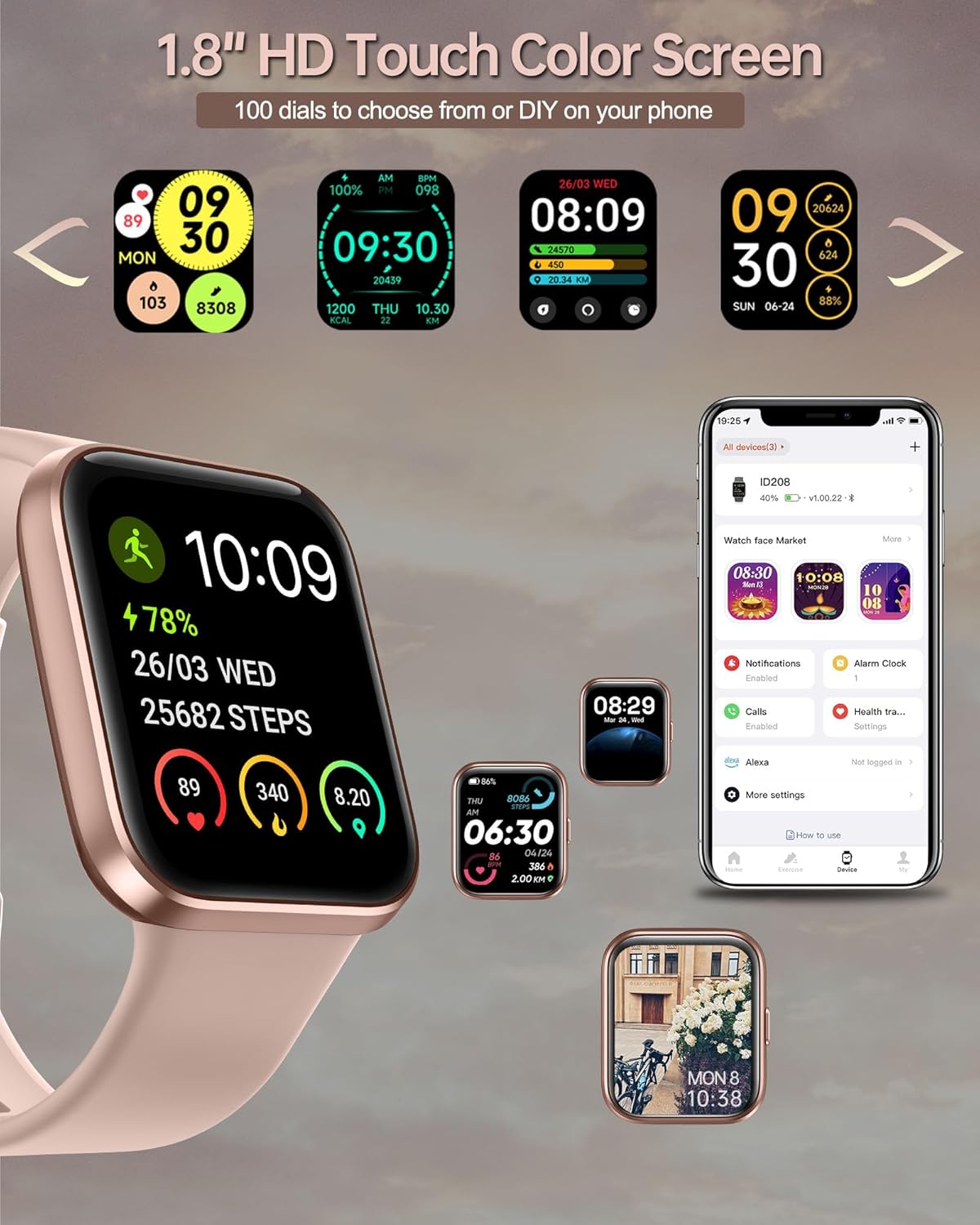 Calling & Message Alerts & Alexa: Connected to your phone via bluetooth and APP, this smartwatch with built-in Alexa voice assistant frees you from the anxiety of missing important calls and messages. By setting call and message alerts to vibrate or ring, you will know exactly which call or message you need to respond to in a timely manner. (Note: The smartwatch can receive messages from Facebook, Twitter, Ins, Whatsapp and more but it does not support sending texts.)