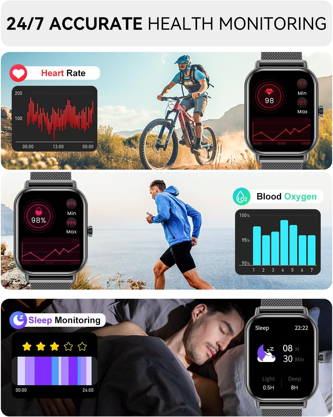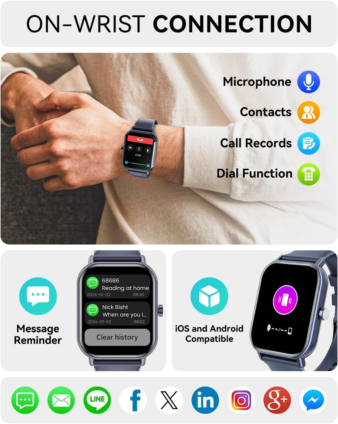 Smart watch with text and call: Smart watches for women men keeps you connected anytime, anywhere with crisp speaker sound quality, allowing you to hear the other party clearly. The smartwatch lets you answer and make calls right from your wrist, and easily sync your mobile contacts. Our ladies watch receives push notifications from popular apps like Instagram, YouTube, Messenger, Gmail, Snapchat, Facebook, Twitter, WhatsApp, and more. Ios android smart watch keeps you informed without ever picking up your phone. (Note: The mens womens watch does not support message replies.)