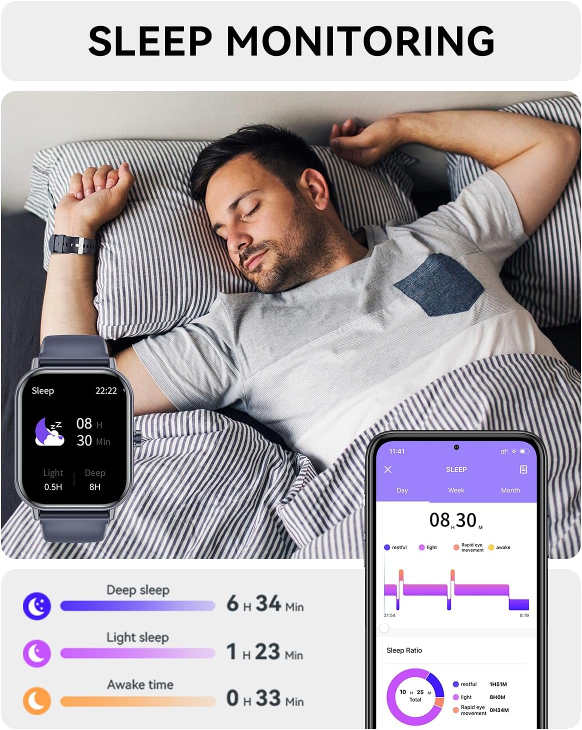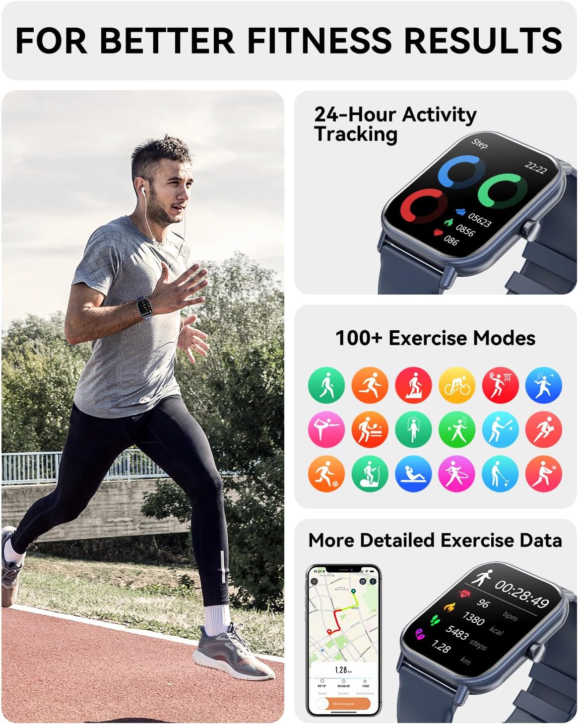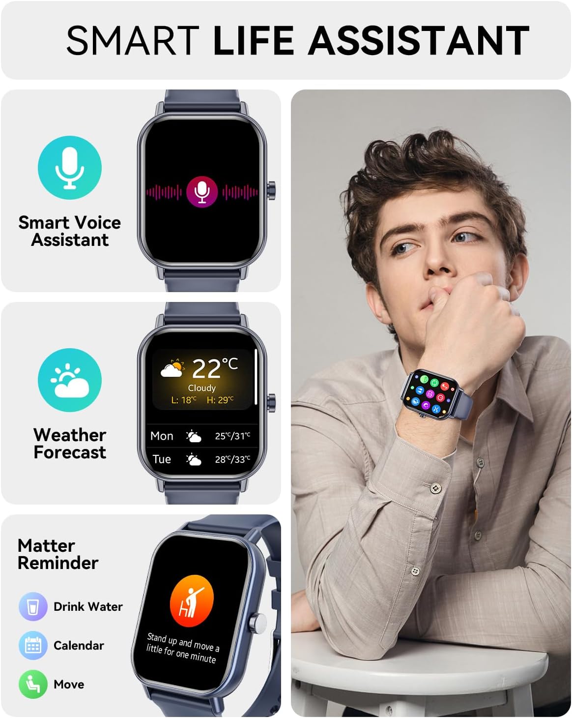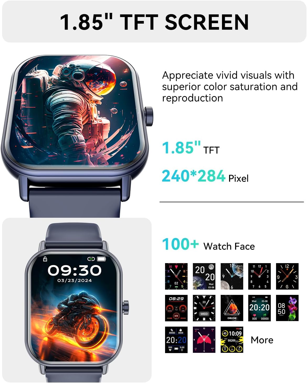 This smartwatch includes Bluetooth calling, smart notifications, DIY watch faces, over 100 sports modes, a 1.85'' screen, an upgraded chip, a built-in speaker, and long battery life.