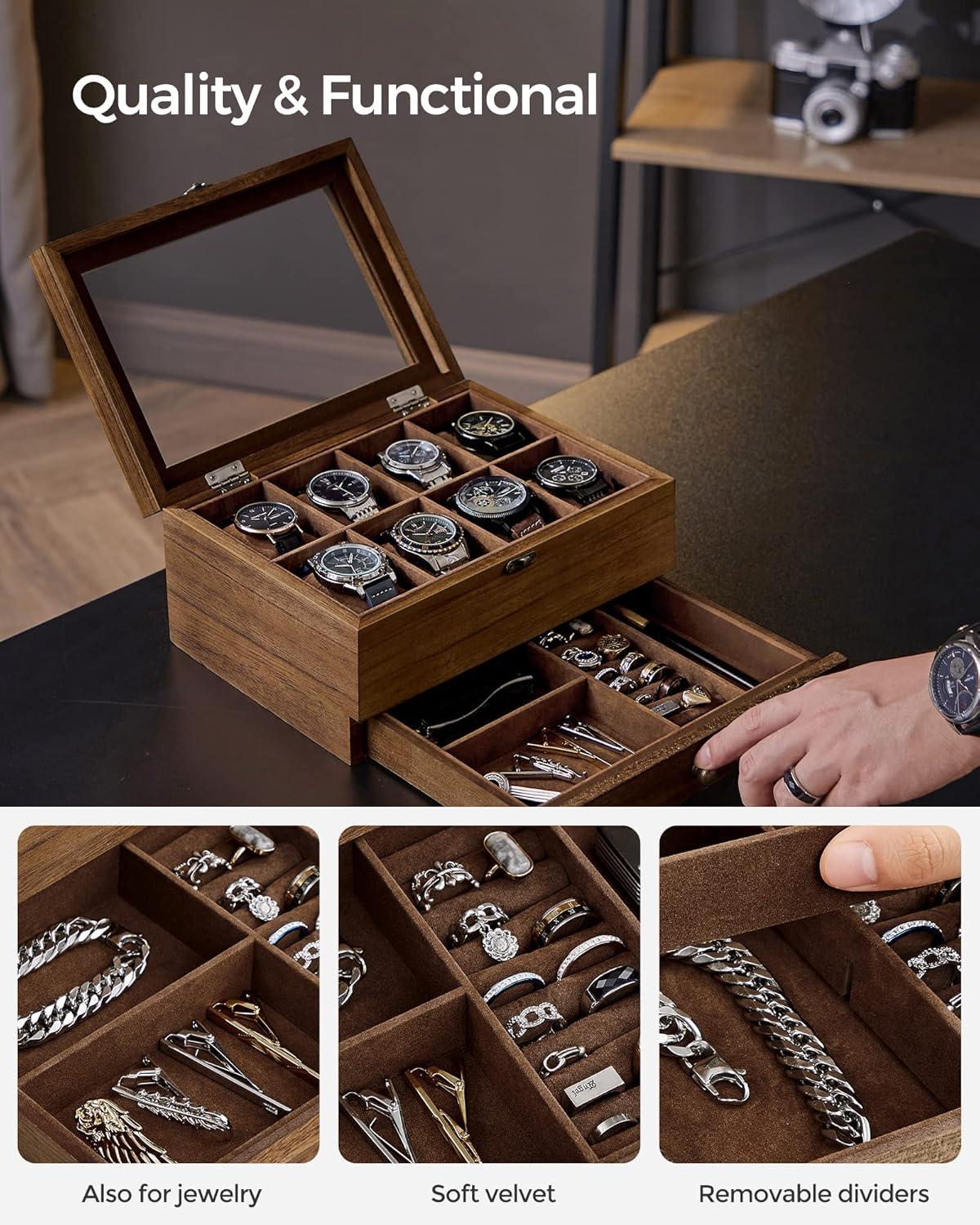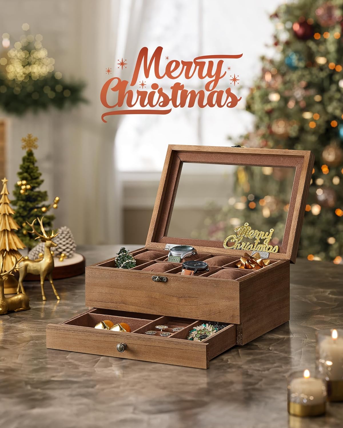 [Style Your Watch Collections] Featuring rustic solid wood with rich grain and a large, clear glass lid, this watch holder not only meets your storage needs, but also accentuates your watch collection and adorns your space
