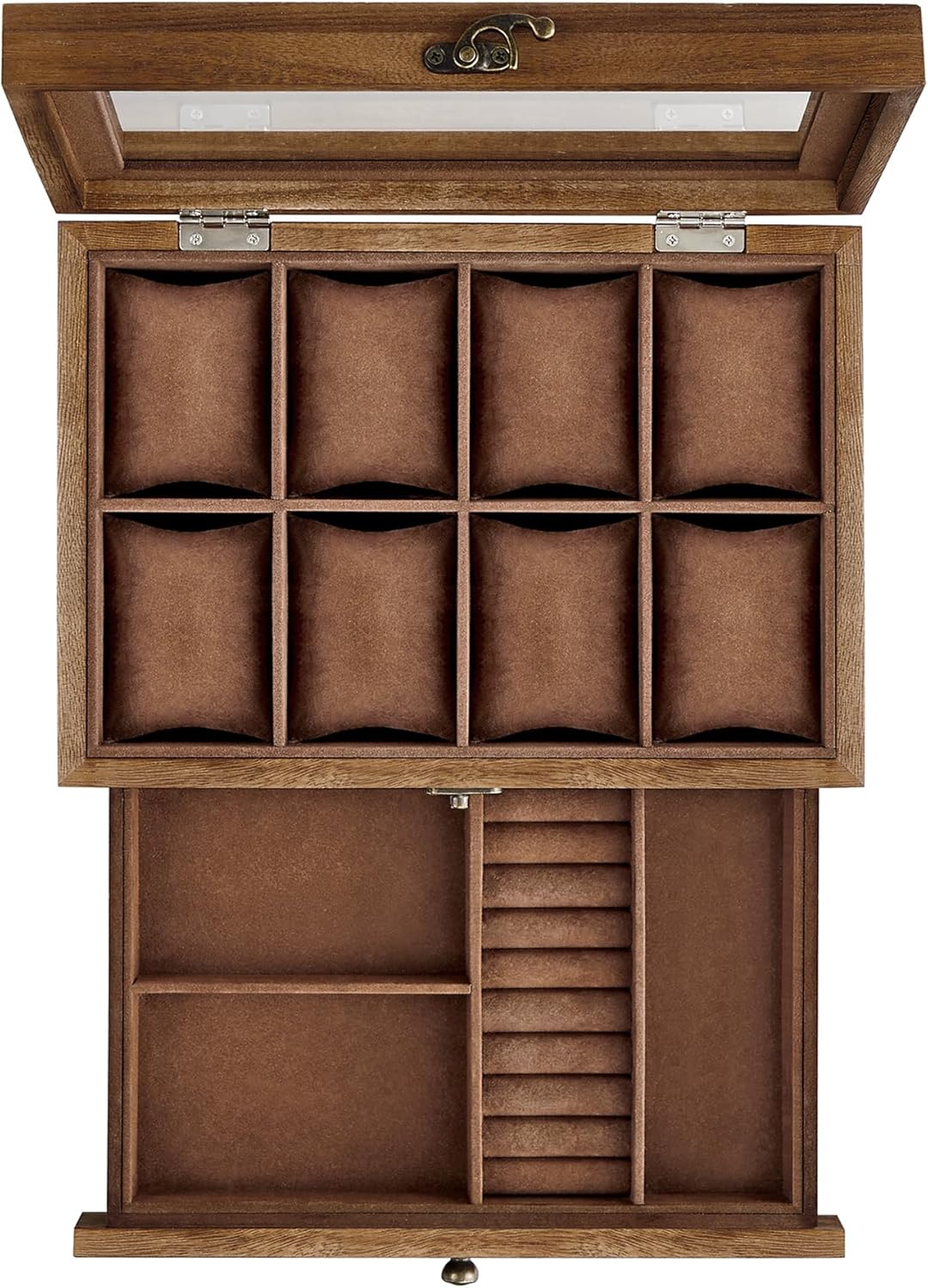 SONGMICS 8-Slot Watch Box, 2-Tier Watch Display Case with Large Glass Lid, Rustic Walnut UJOW008K01