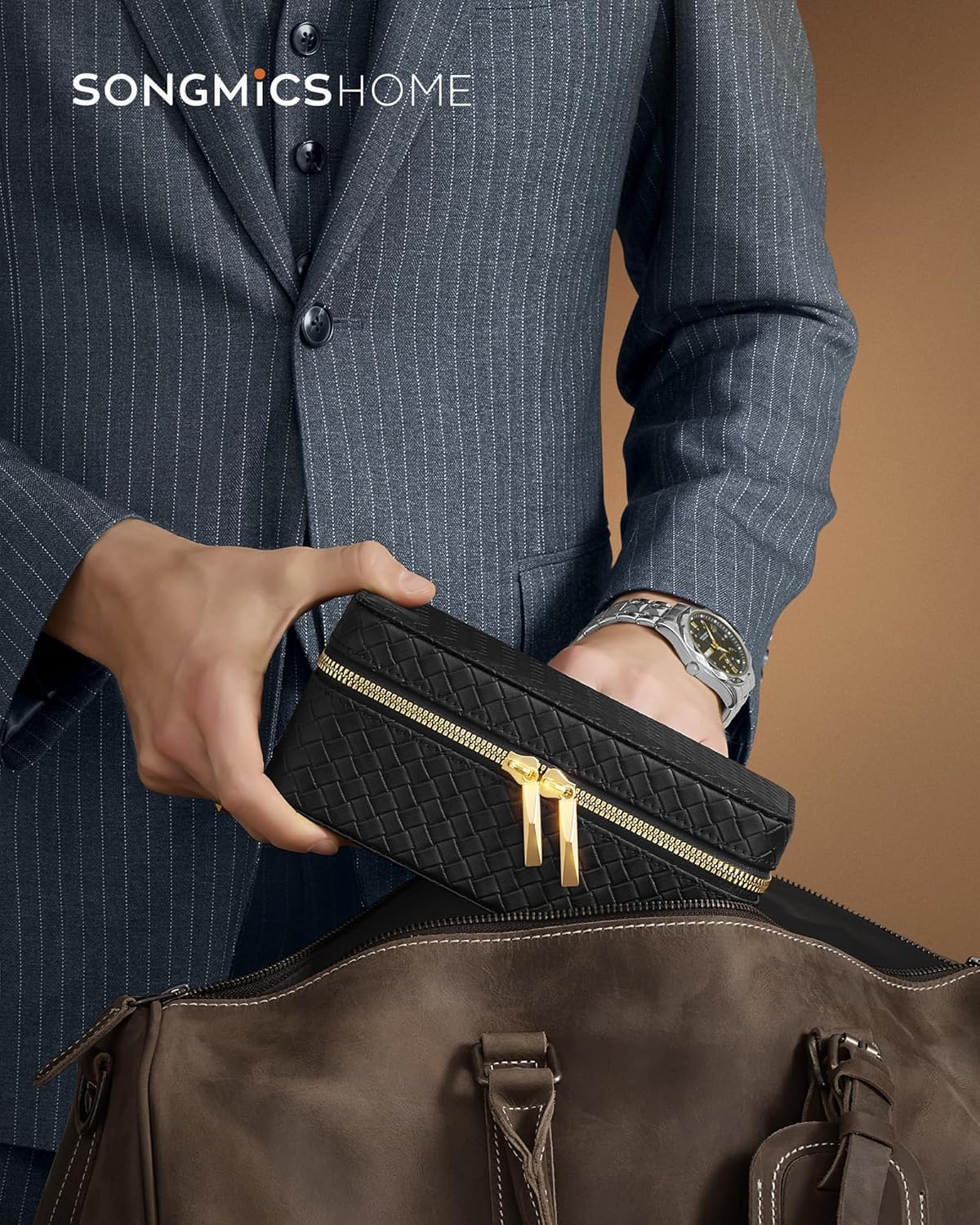 【SHOWCASE YOUR STYLE】Timeless elegance meets modern luxury with this 3-watch travel case from SONGMICS HOME RONNE Collection. Boasting woven embossed PU leather accented with baguette cut-inspired hardware, it’s your style declaration