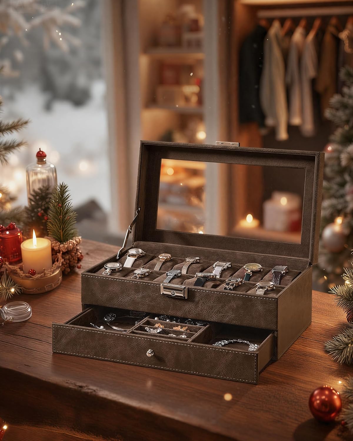 2-Layer Storage: The top layer with 12 slots offers a cozy home for your watches with a dial size up to 48 mm, and a bottom drawer with various areas offers extra space for your necklaces, rings, earrings, and more