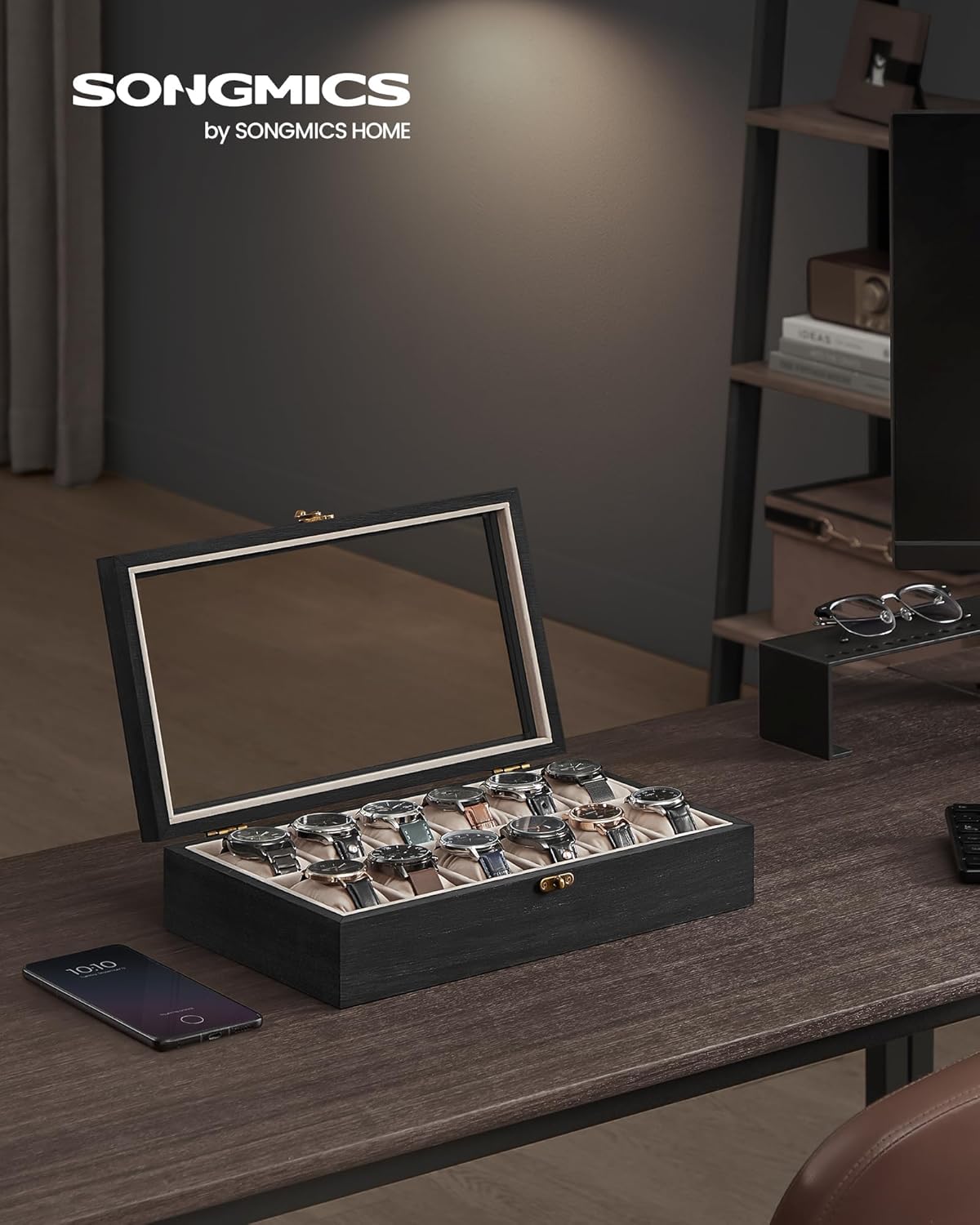 SONGMICS Watch Box, 12-Slot Watch Case, Solid Wood Watch Box Organizer with Glass Lid, Ebony Black UJOW120B01