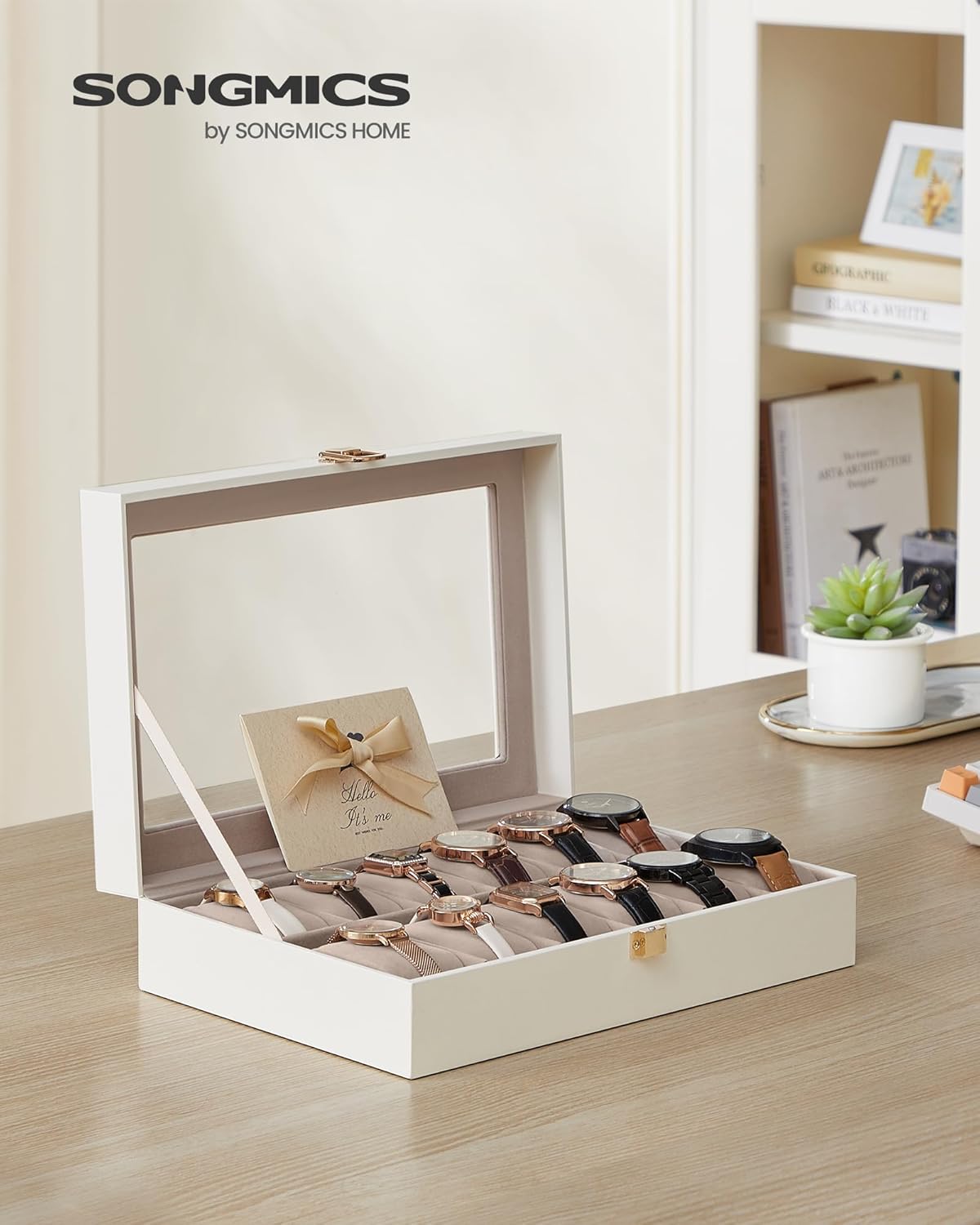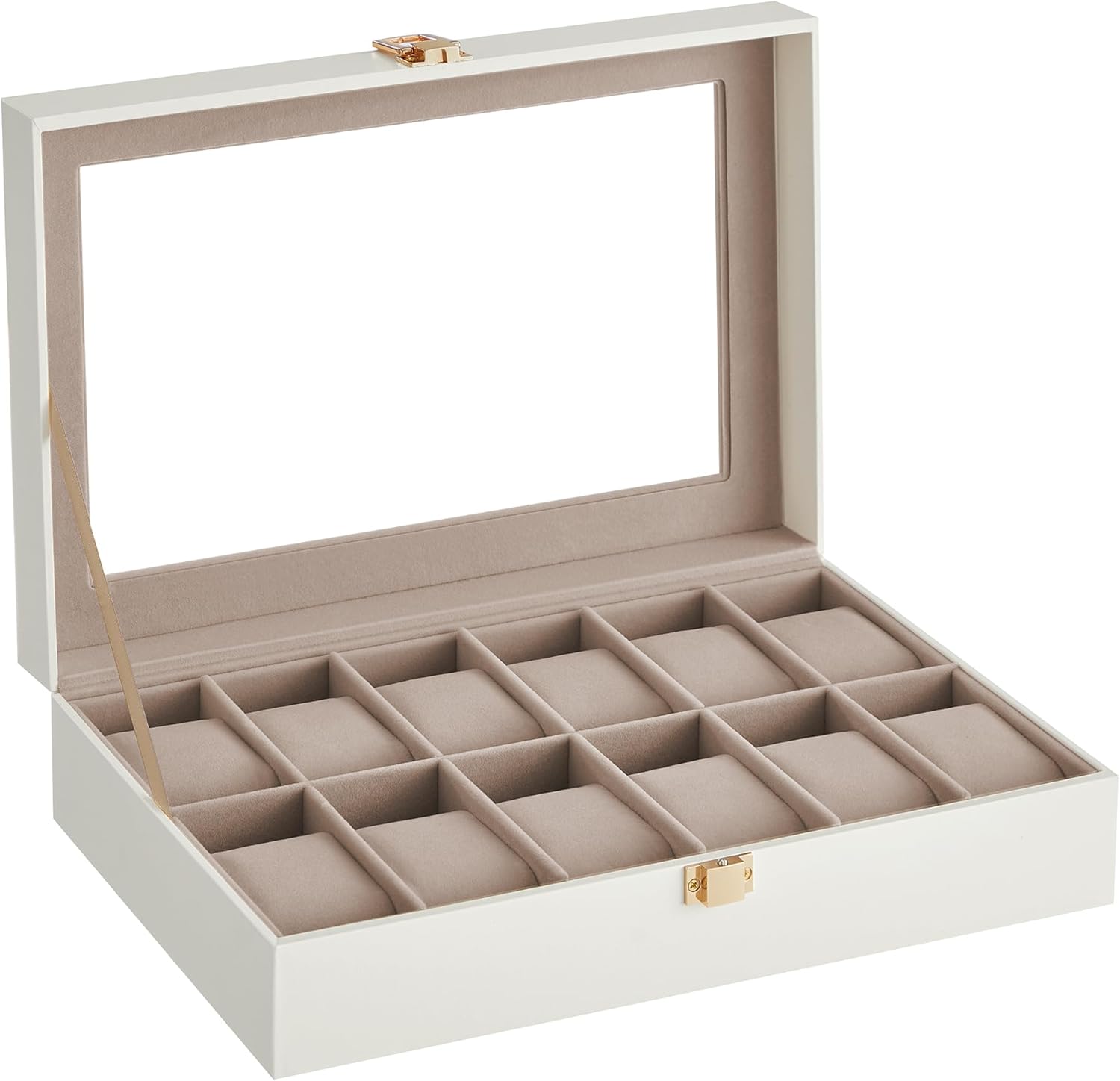 SONGMICS Watch Box, 12-Slot Watch Case, Watch Box Organizer, Cloud White Synthetic Leather, Cappuccino Beige Lining UJWB120W01