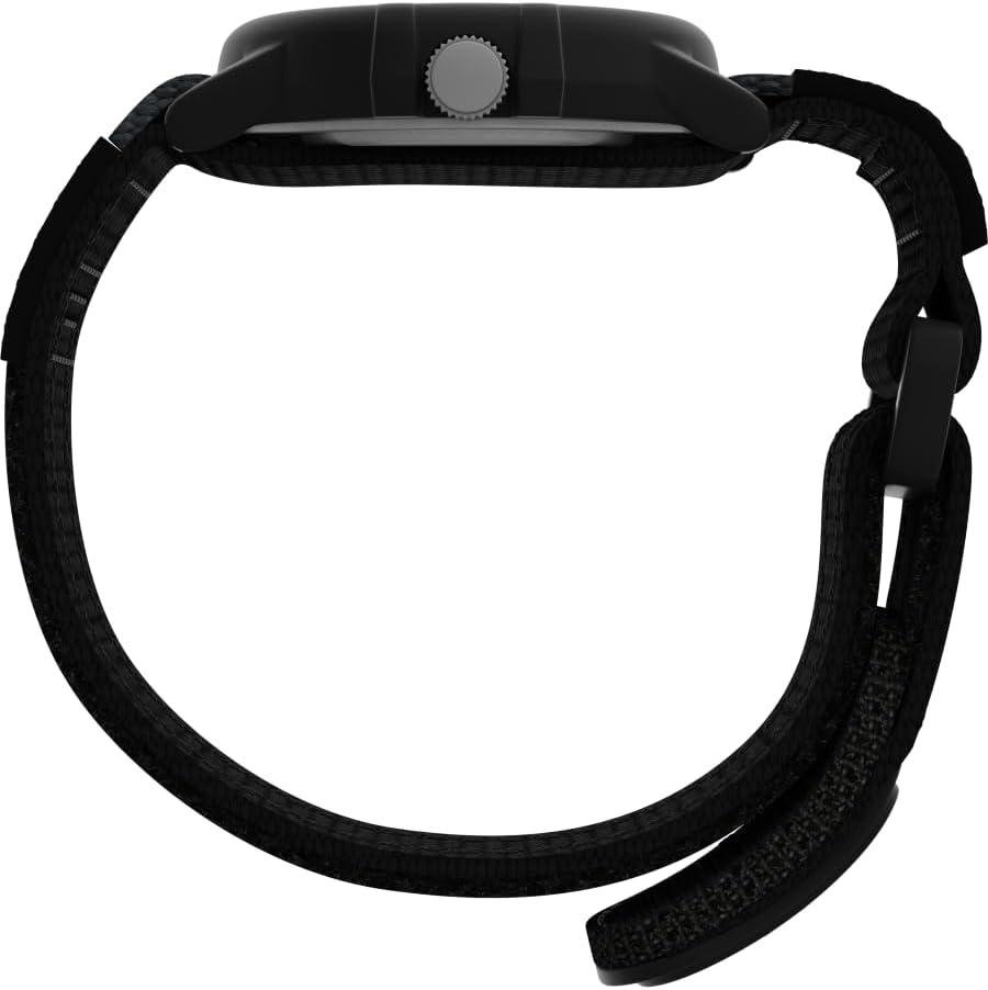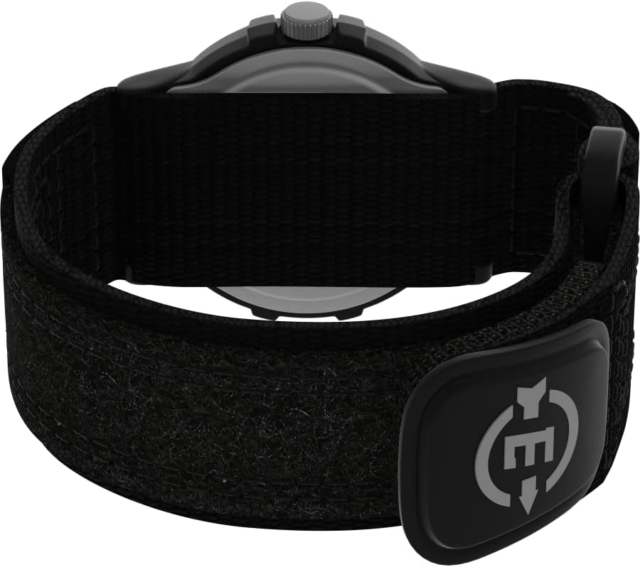 The watch is designed with a nylon Fast Wrap strap with Velcro fastener, allowing for adjustable sizing to fit comfortably on the wrist.