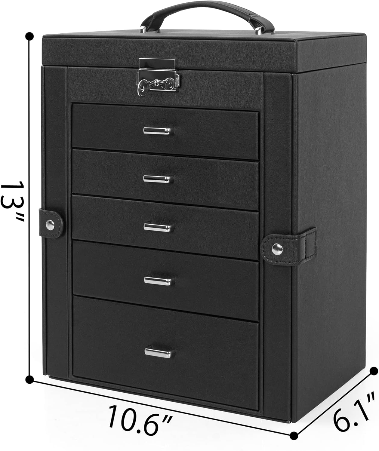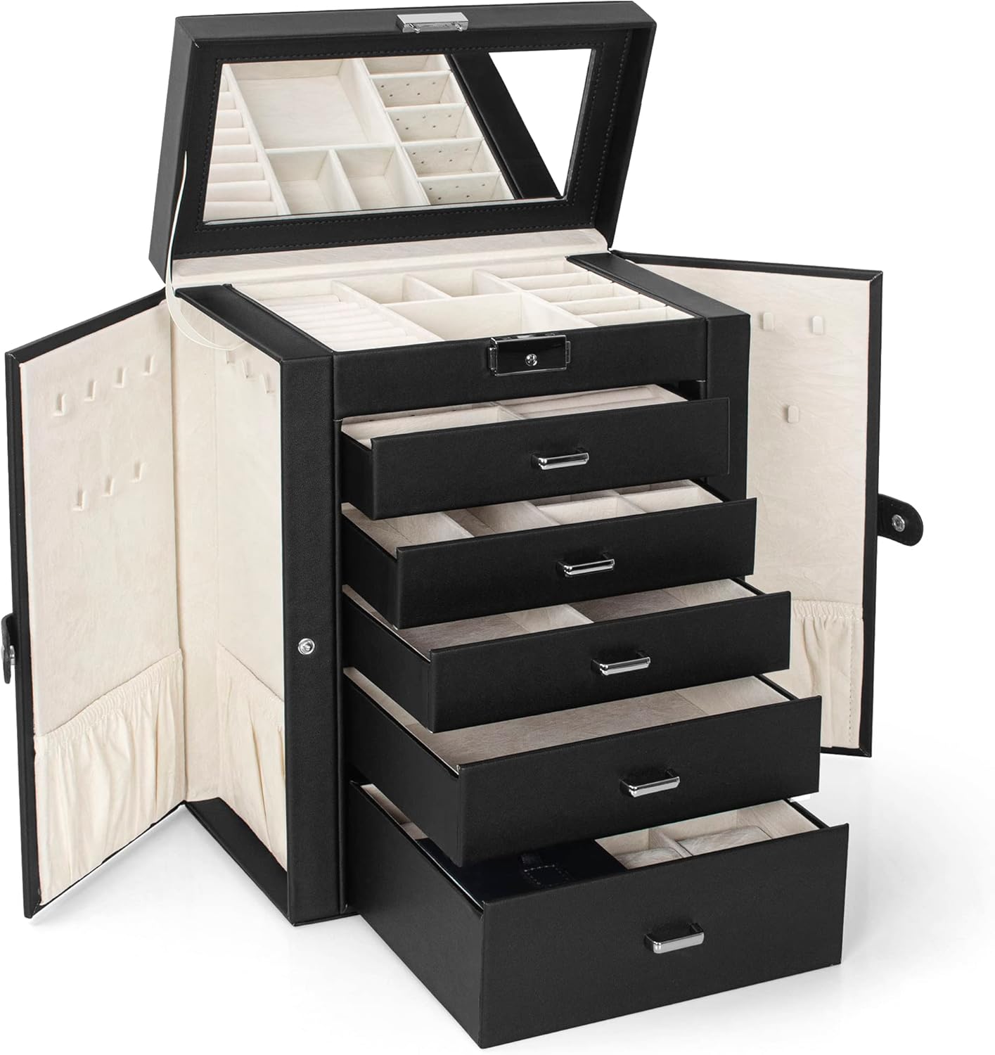 WHAT CAN BE PLACED INSIDE? With 5 drawers, 2 side doors for necklaces, and top storage compartment for rings and accessories, this 26.7cm x 15cm x 33cm jewelry case rescues you from taking 20 minutes to untangle what you want to wear