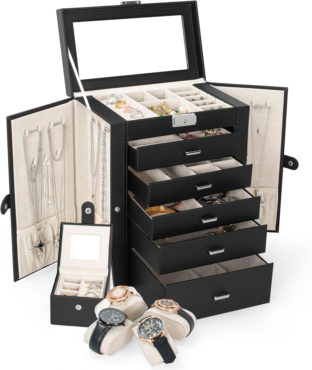 TORIBIO 2 in 1 Huge Jewelry Box 6-Tier Leather Jewelry Organizer Case with Small Travel Case for Women Girls Ring Necklace Earring Bracelet Watches with Big Mirror Black