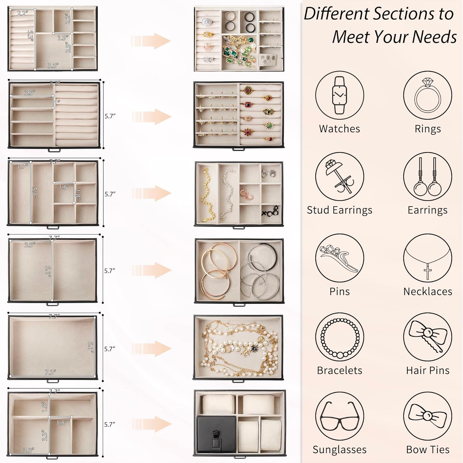 ELEGANT & DURABLE: Attractive appearance with black faux leather surface and soft velvet lining.large enough to hold your watches, necklaces, earrings, bracelets, hairpins, brooches and other jewelry.