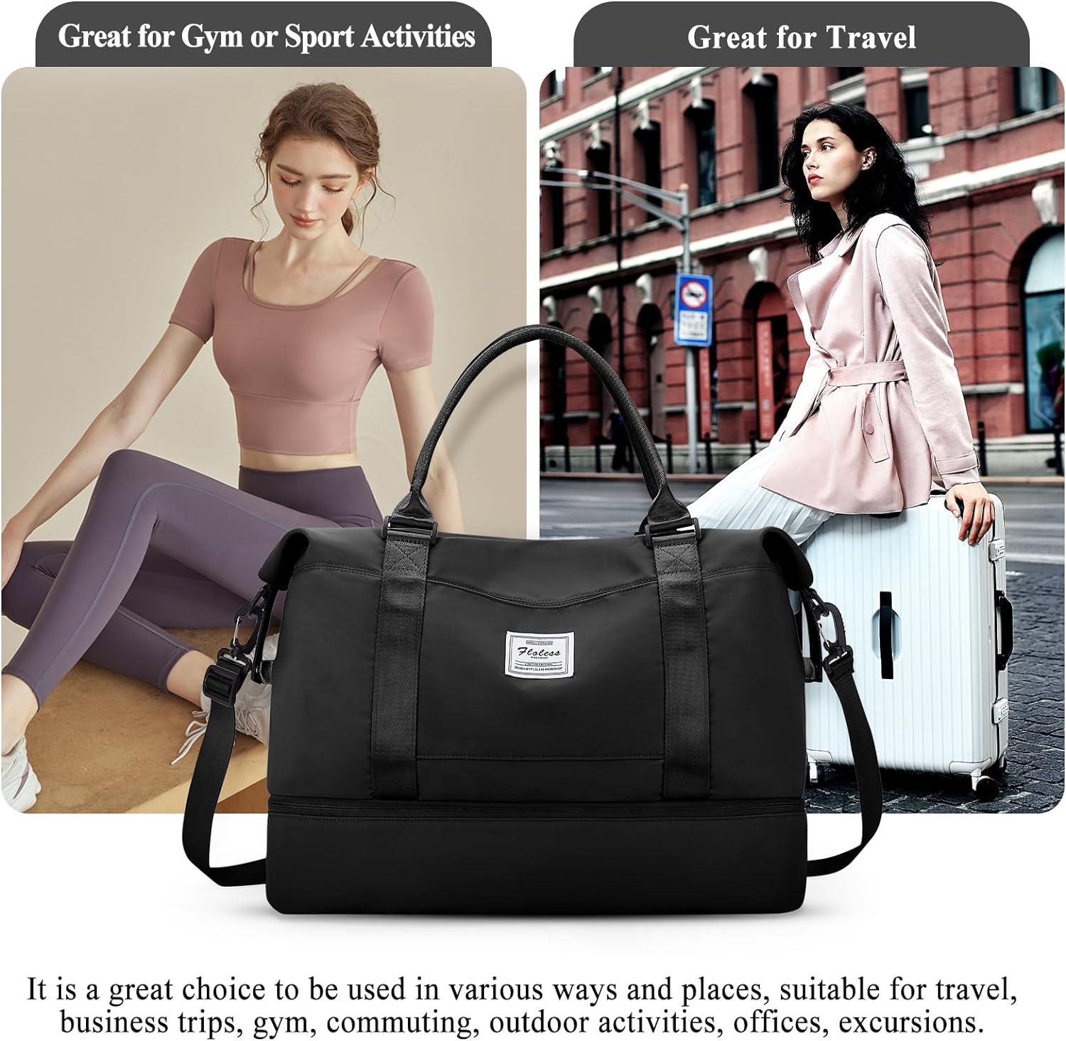 【Weekender Bag with Shoe Compartment】A separate shoe compartment can help you carry and keep your shoes better in your travel bag,even if it is dirty and the other objects still won’t get stained.