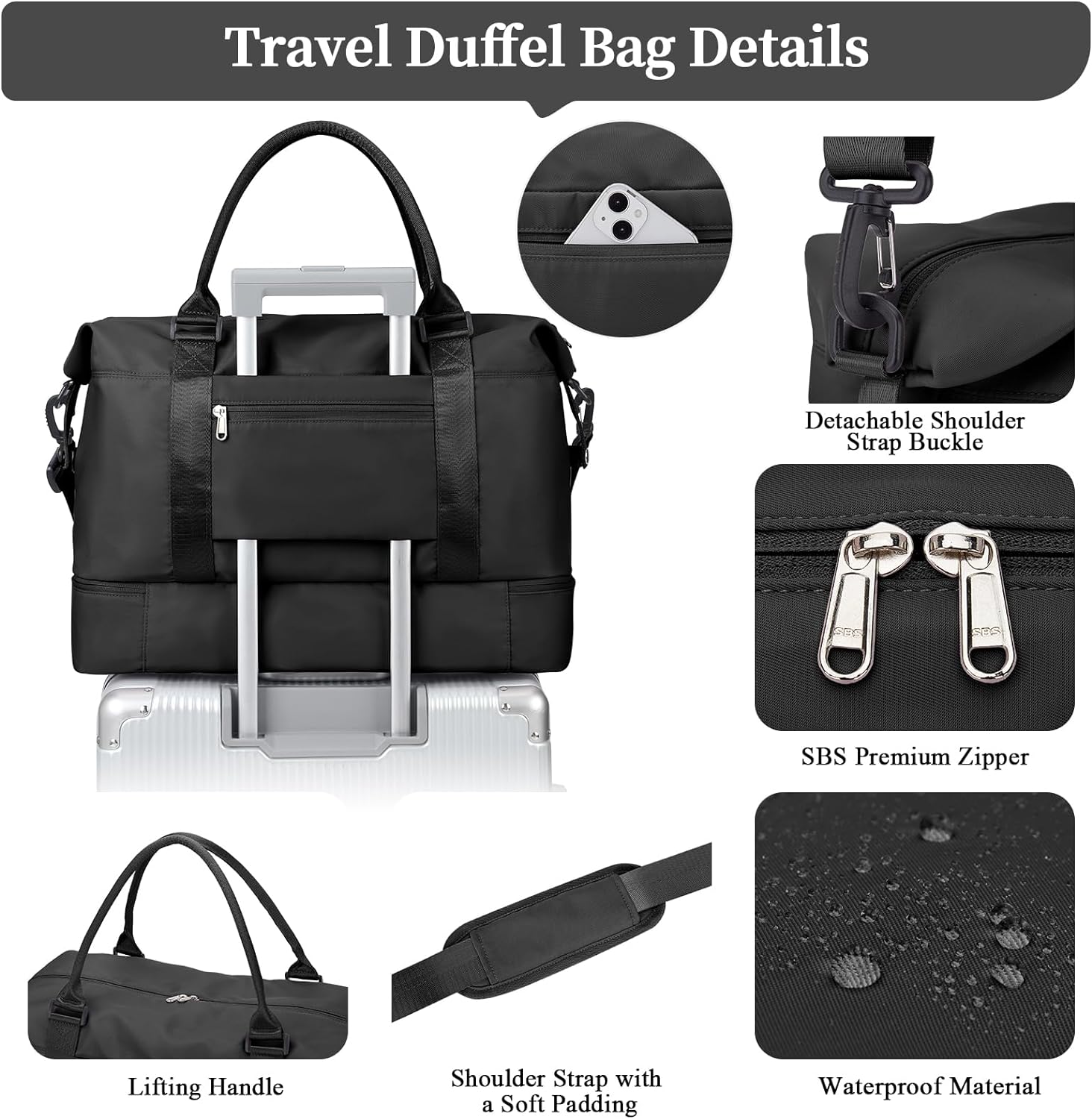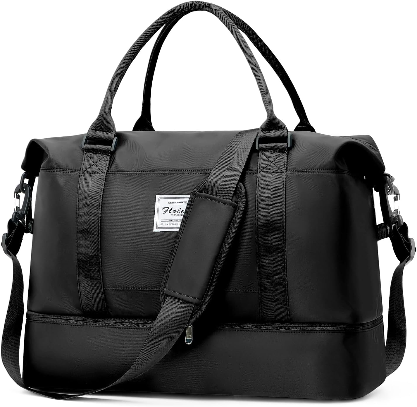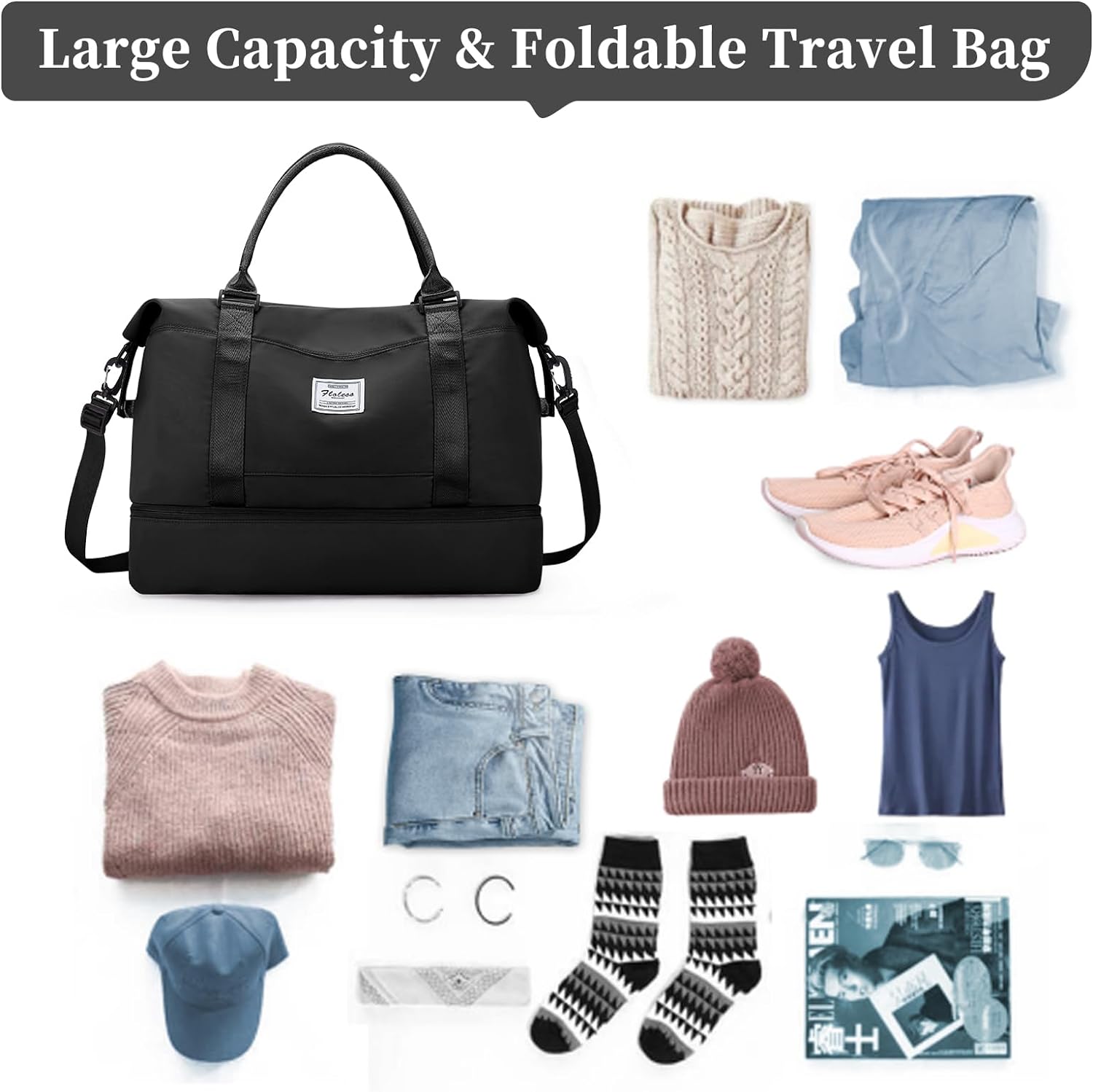 Travel Duffel Bag, Sports Gym Tote Bag for Women, Carry on Luggage Bag for Airplanes, Lightweight Weekender Overnight Shoulder Bag Waterproof Beach Hospital Bag with Shoes Compartment,A1-Black