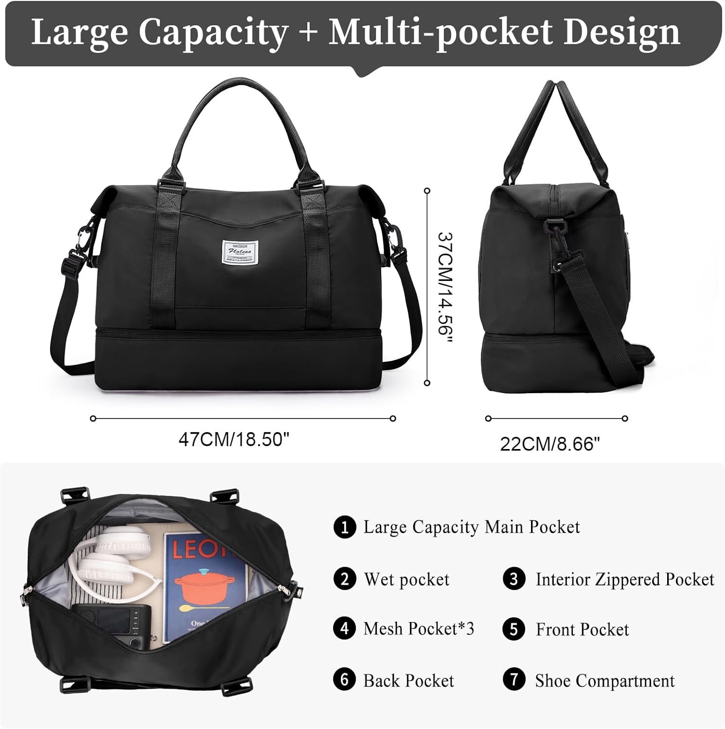 【Large and Multiple Pockets Travel bag】This travel bag has 6 multiple internal and 3 external organizational pockets,which ensure you have a place for all thing. The dimensions of weekender bags for women are 47*36*22CM/18.50*14.1*8.6. You can carry it onto an airplane. Large storage space for a clothes for short trip. It has a capacity of 30L and can hold 6 to 8 pieces of summer clothes,cosmetics, toiletries,etc.