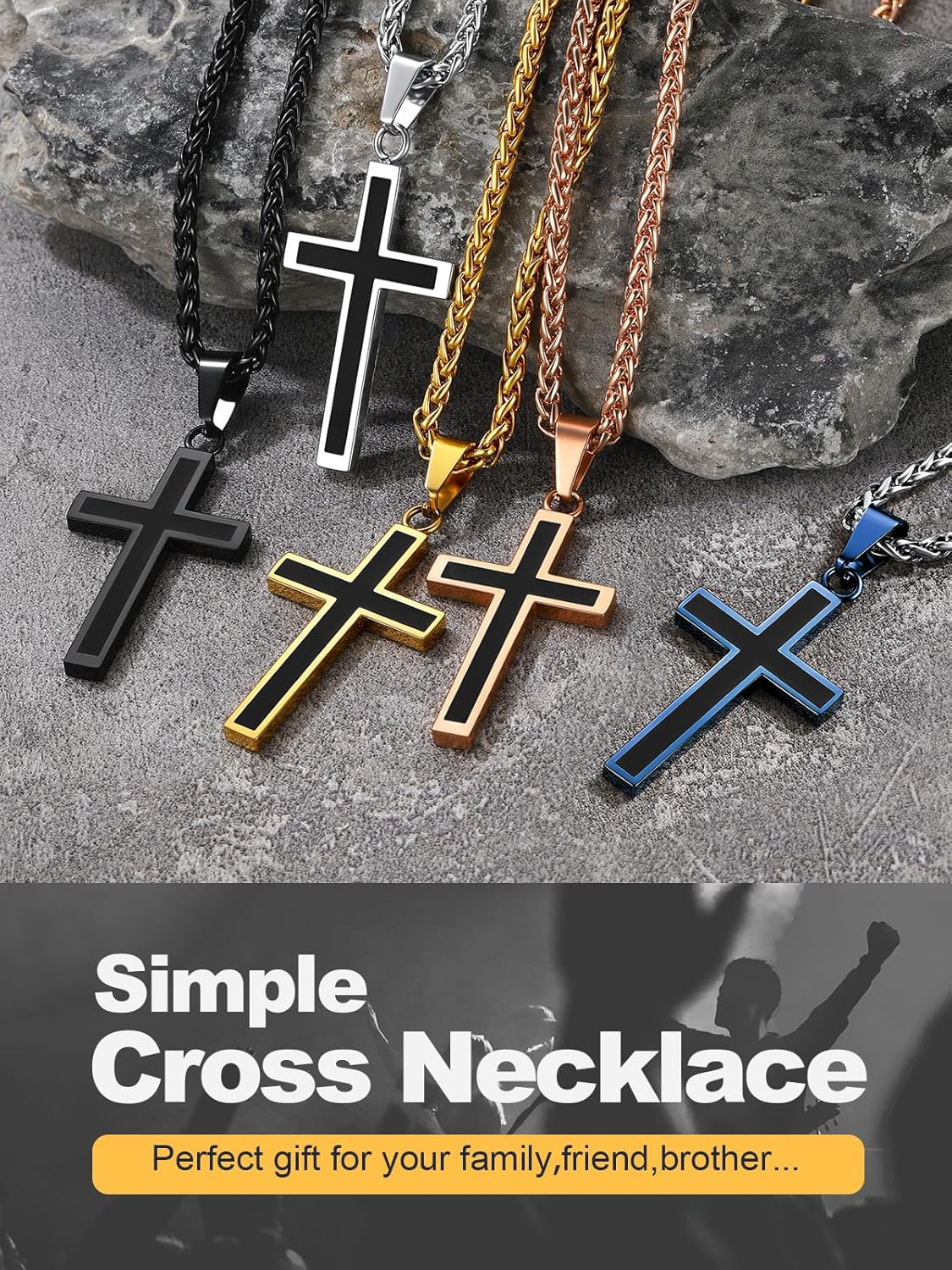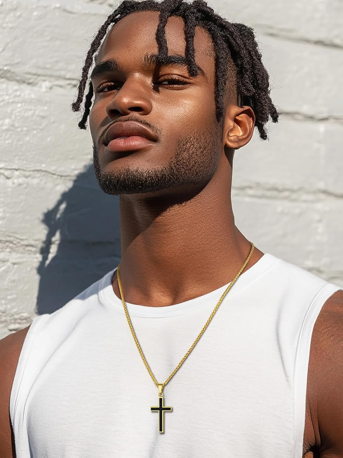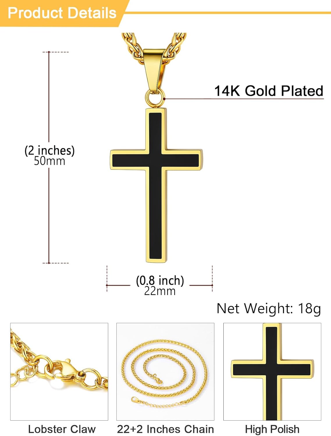 The cross pendant measures 5 cm by 2.2 cm, and the chain is a wheat chain that is 20 inches long with an additional 2 inches for extension.