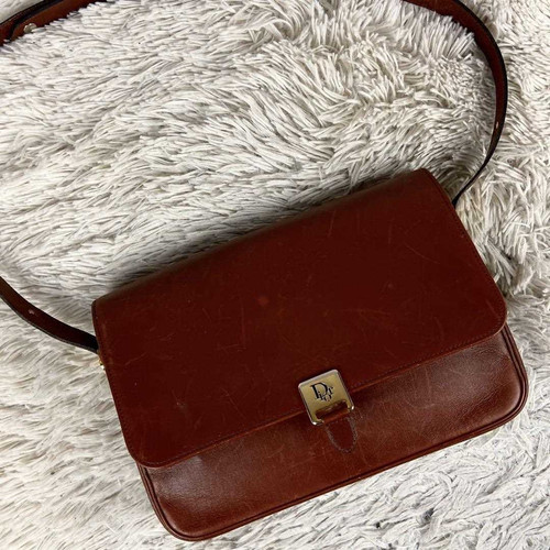 Vintage Christian Dior Brown Leather/Copper Fabric Flap Top Handle Bag