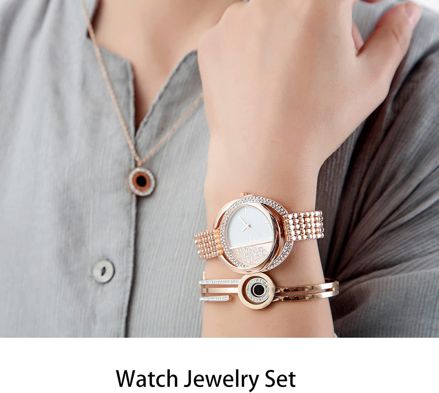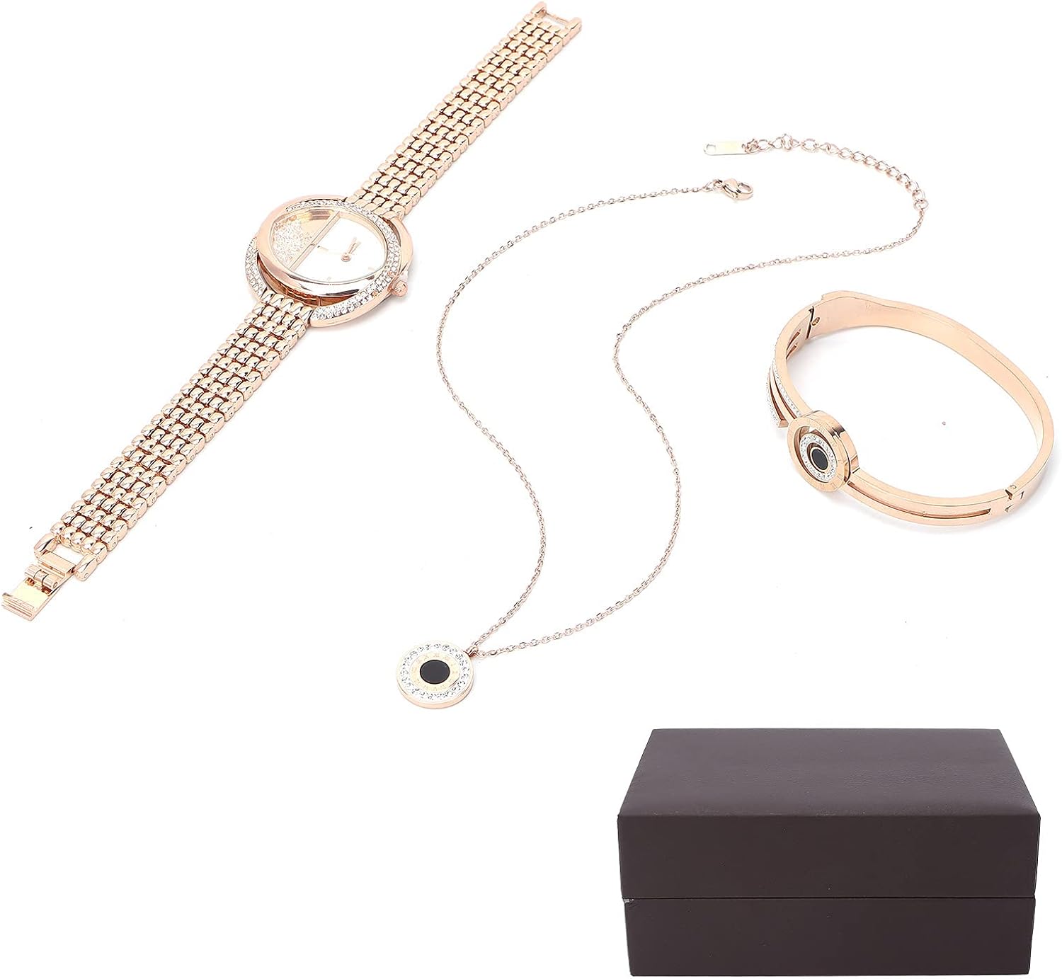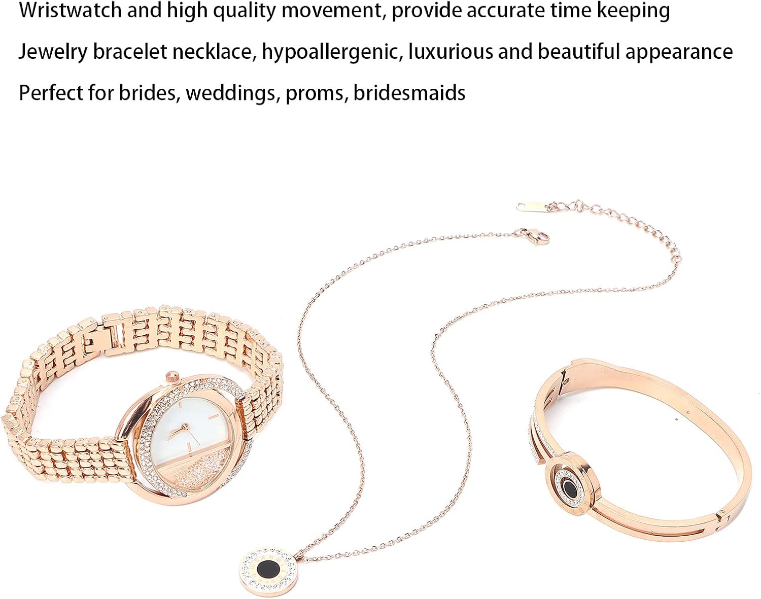 Watch and Bangle Set, Business Style Watch Bracelet Necklace Set Glitter Crystal Women’s Wrist Watches Jewelry Set Gifts for Gradution Working Anniversary for Ladies Women(Rose Gold)