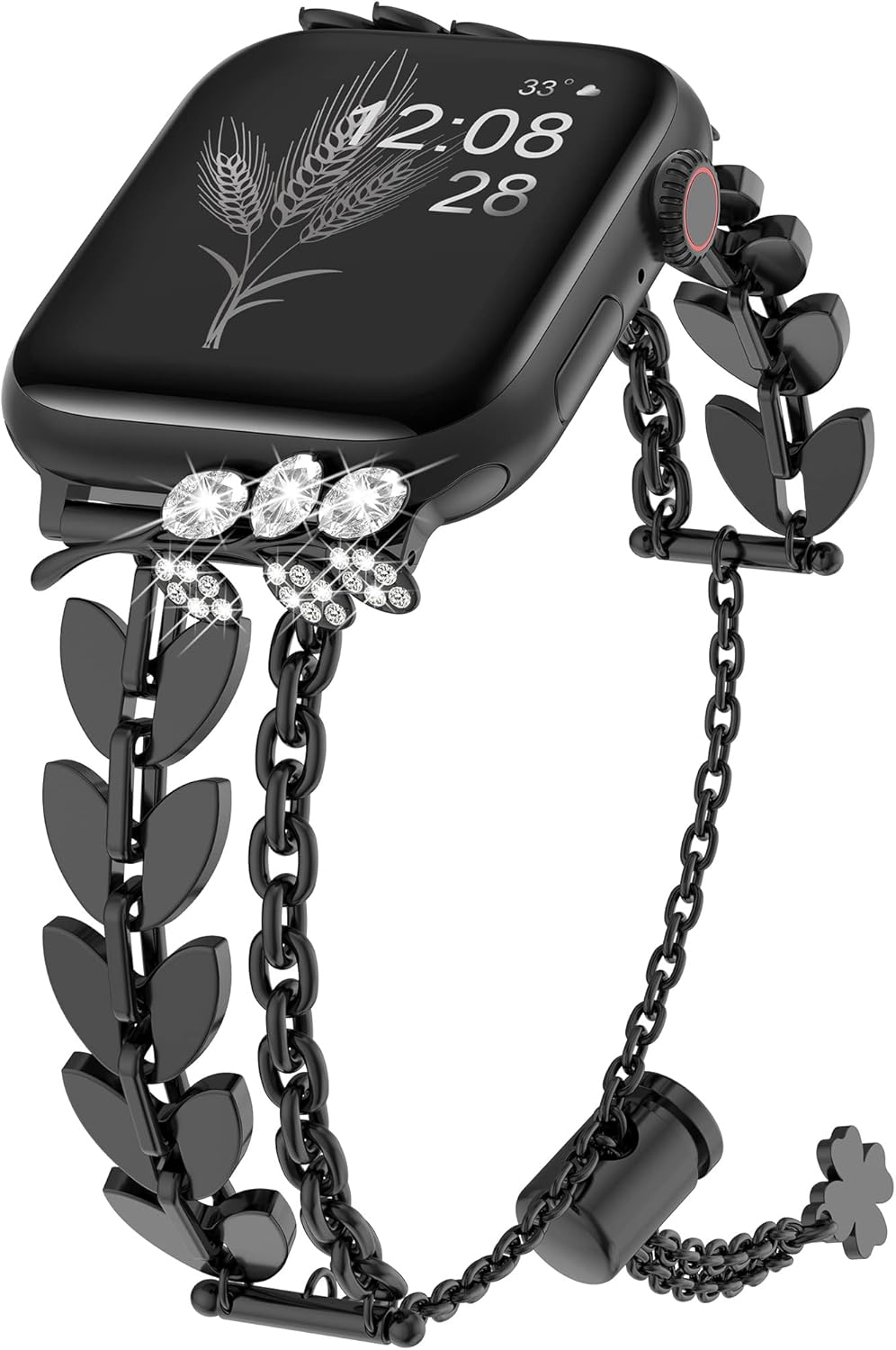 Wearlizer Wheat Ear Bracelet Compatible with Apple Watch Bands 40/38/41/42mm Women, Bling Diamond Charms iWatch Bands Stylish Dressy Metal Strap for Apple Watch Series 10 9 8 7 6 5 4 3 2 1 SE, Black