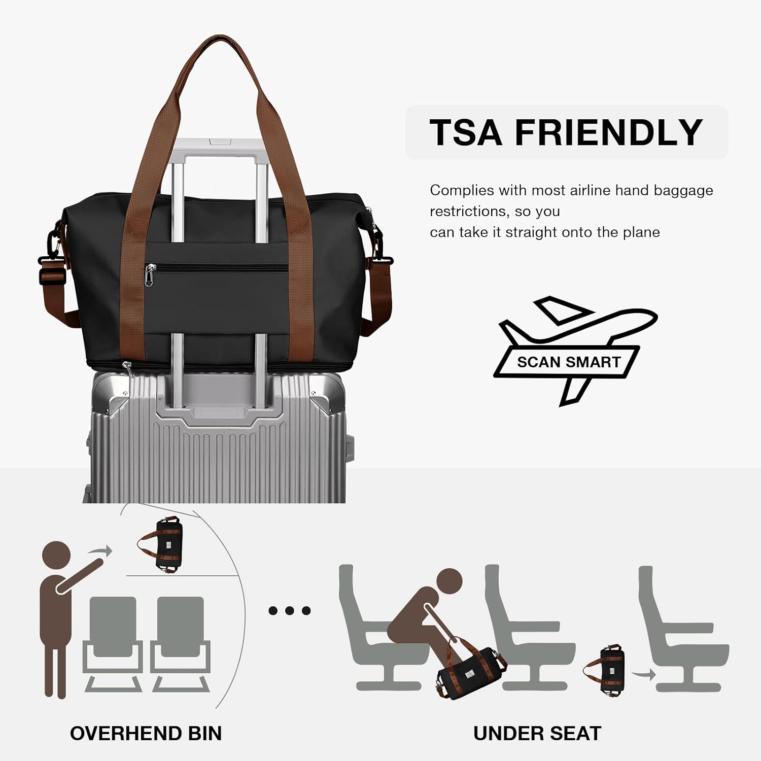 【High Capacity Travel Bag】Travel Bag has three multiple internal and four external organizational pockets,which ensure you placed more scientifically and orderly.The overnight bag for women has Large Capacity.Ordinary size :41*26*22CM,Expansion Dimension:41*37*22CM.You can carry it onto an airplane. Large storage space for a clothes for short trip.It has a capacity of 35L and can hold 6 to 8 pieces of summer clothes,Cosmetics,toiletries,wallets,keys,earphones,mobile power,mobile phones,files.