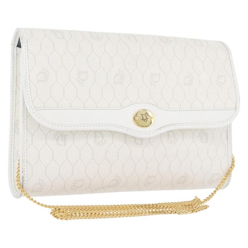 Christian Dior Honeycomb Canvas Chain Shoulder Bag PVC White Gold Auth 169860