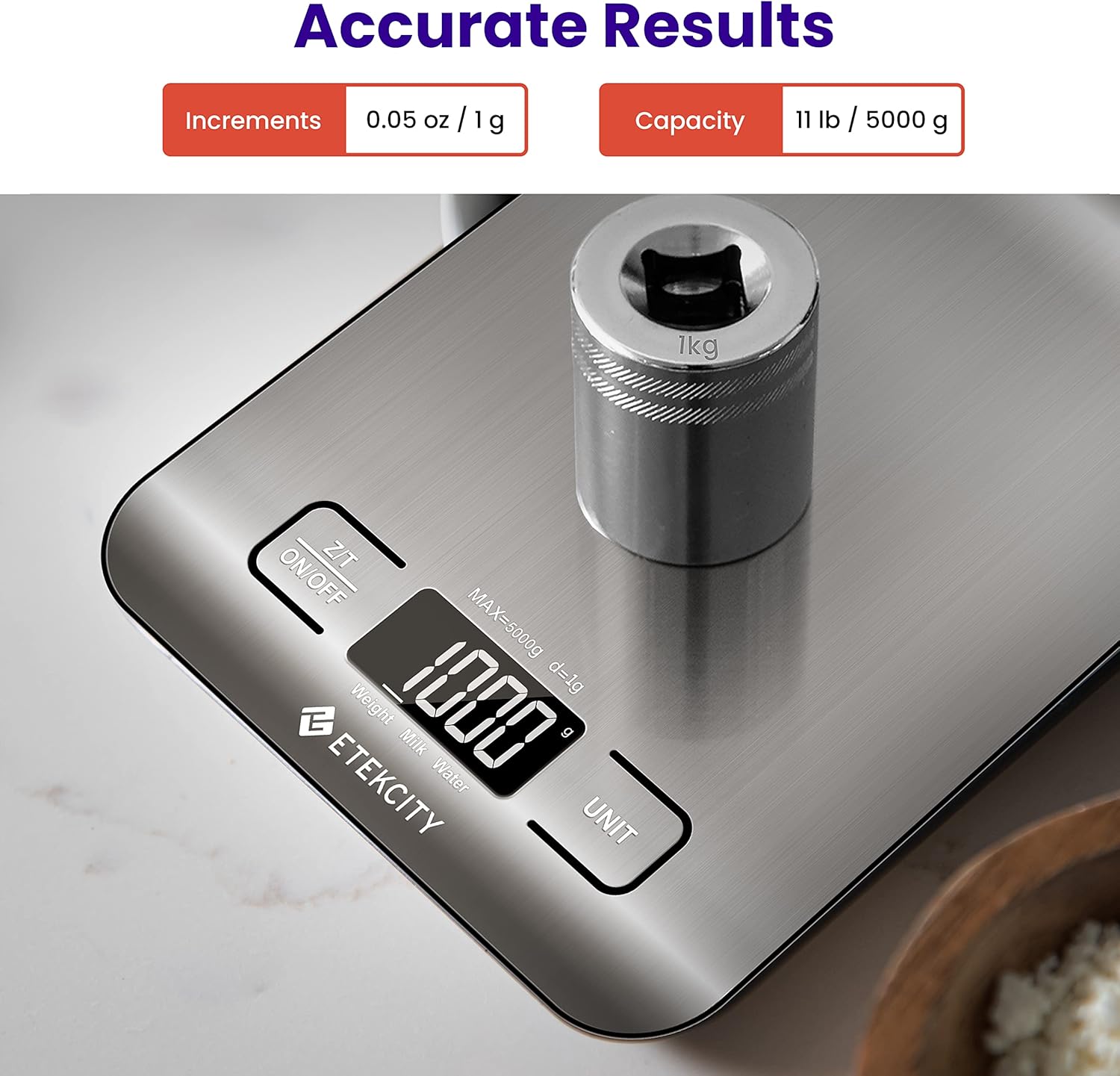High-Precision Weight: Etekcity digital food scale equipped with four built-in high-precision load sensors have 0.05oz/1g increments when adding ingredients, capacity 5kg/11lb