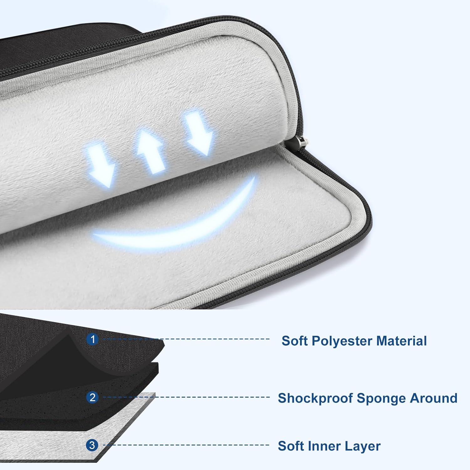 Features a polyester foam padding layer and fluffy fleece fabric lining for bump and shock absorption and protection of your device against bump, shock and accidental scratches.