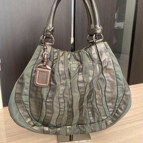 PRADA Gauvre Nappa Leather Shoulder Bag Gray Khaki Gathers Authentic Women’s